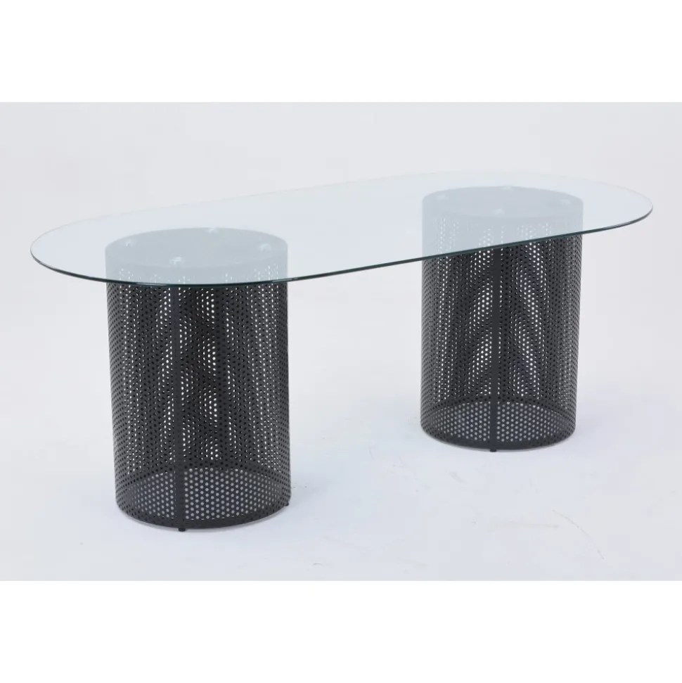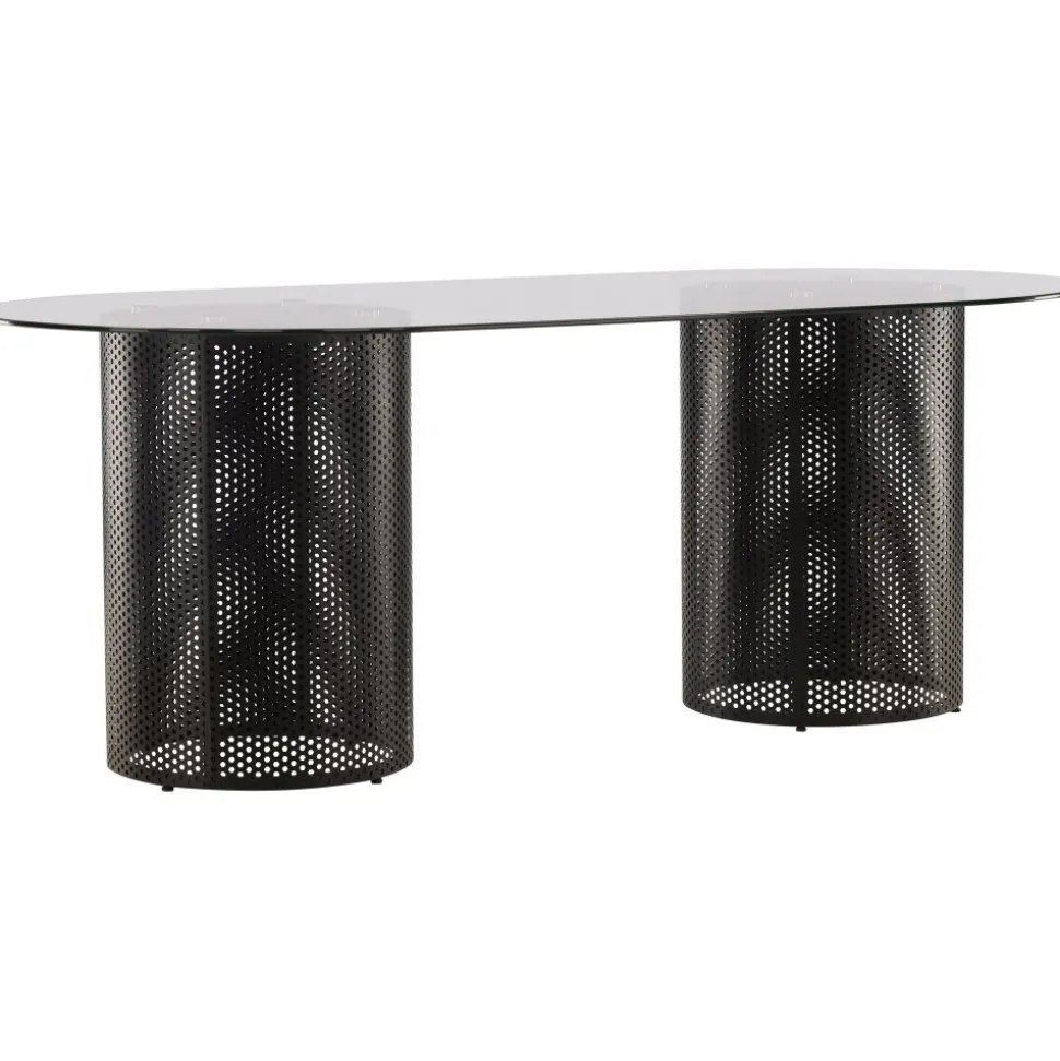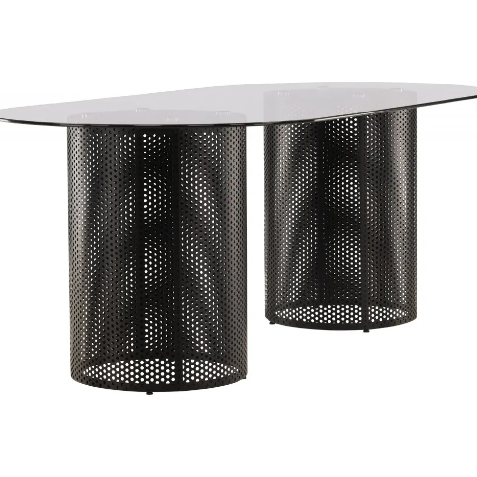 Det moderna matbordet som imponerar. Det här matbordet tillhör Lustig kollektionen och är lika genomtänkt som iögonfallande. Bordsskivan är oval i klarglas vilket ger en lyxig elegans till helhetsintrycket. De två cylinderformade benen är robusta i svart stål och har en smakfull industriell design som drar blickarna till sig. Matcha med ett par snygga matstolar så får du en komplett matgrupp till framtida måltider.