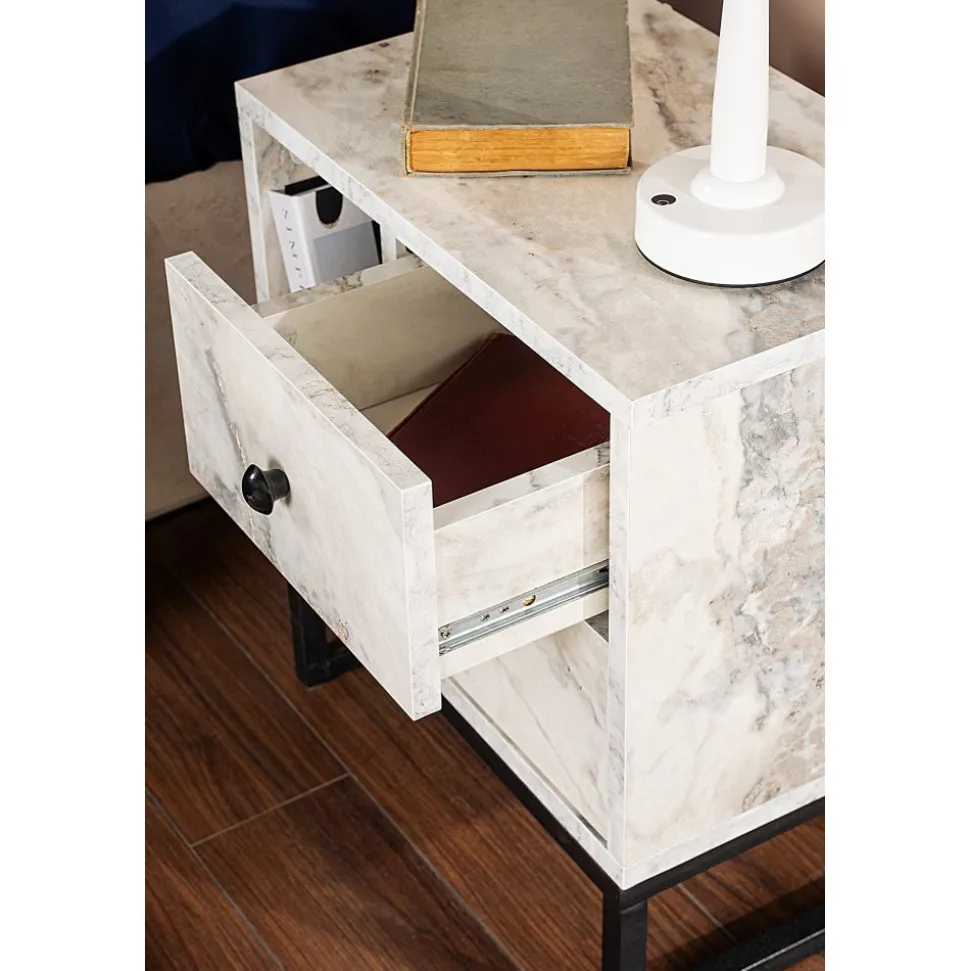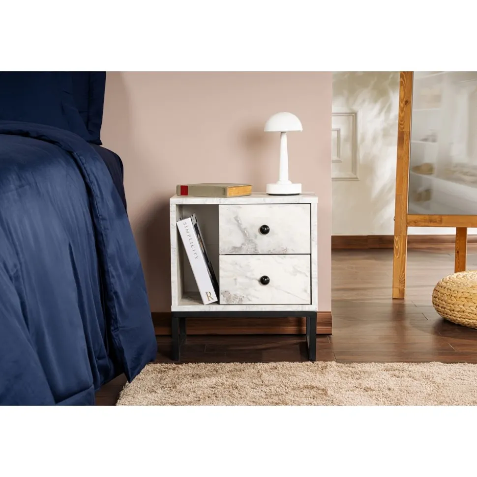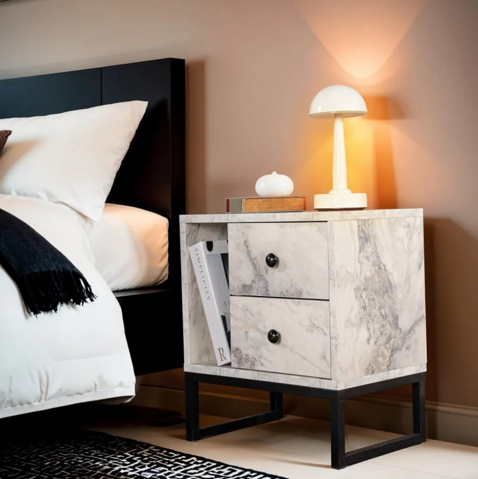 Sängbord av melaminbelagd spånskiva.