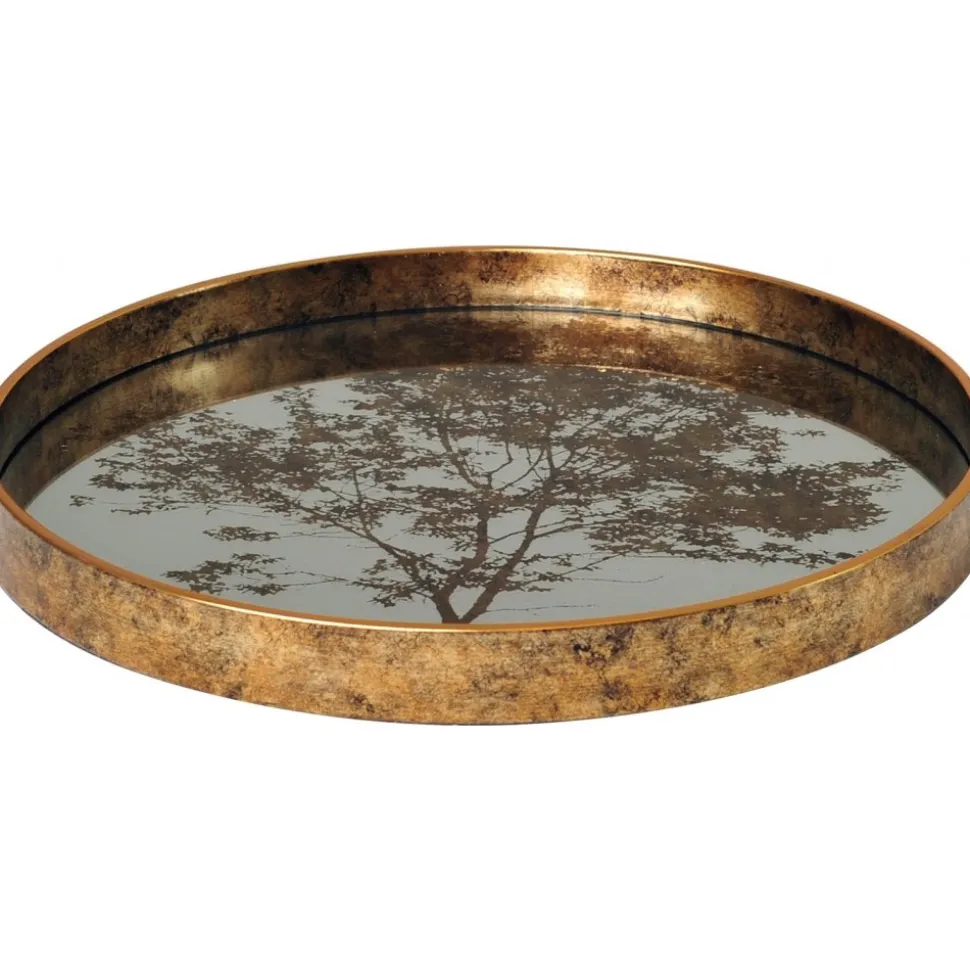 Rund serveringsbricka med sarg i mässingsfärgad metall och botten i spegelglas med motiv av ett träd.