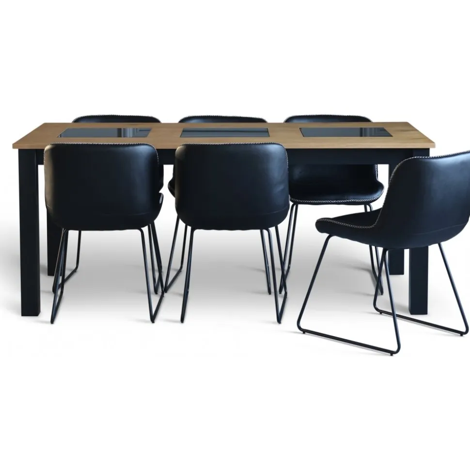 Matgrupp med matbord och 6 st stolar ur serien Texas och Granit. Matbordet är gjort ek och fanèrad ek med svarta glasplattor. Stolarna är gjorda av metall med klädsel av konstläder(PU).
