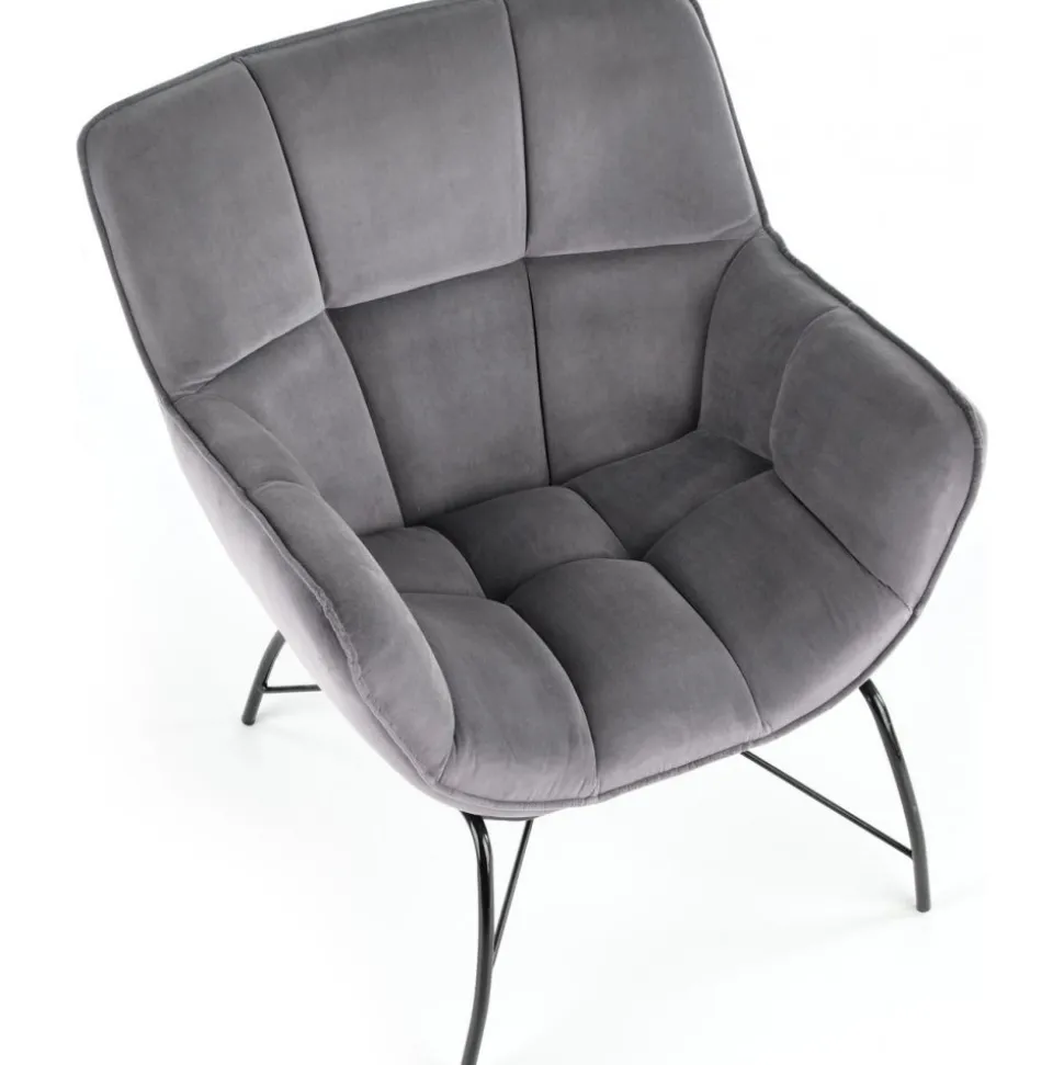 Fåtölj med underrede av pulverlackerad stål och klädsel av sammetstyg.