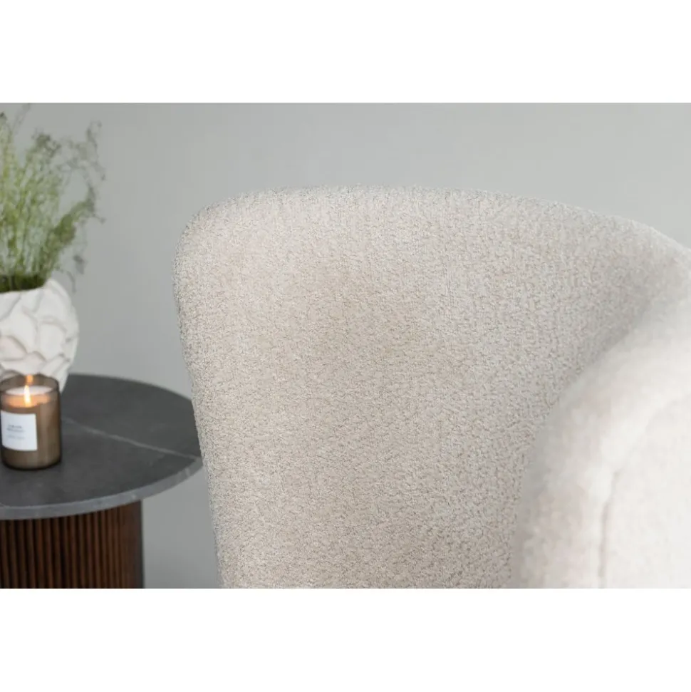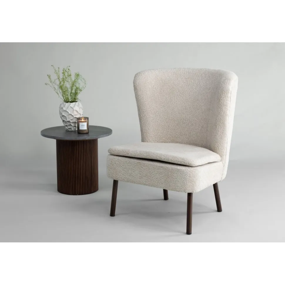 Fåtöljen med en inbjudande och följsam utformning som gör den lika stilren som bekväm. Sitsen är helklädd i beige boucletyg och stolsbenen är lätt utsvängda i jordnära valnötskulör. Placera den solitär i läshörnan eller tillsammans med soffgruppen för att skapa plats för fler gäster. Det ska kännas mysigt att komma hem.