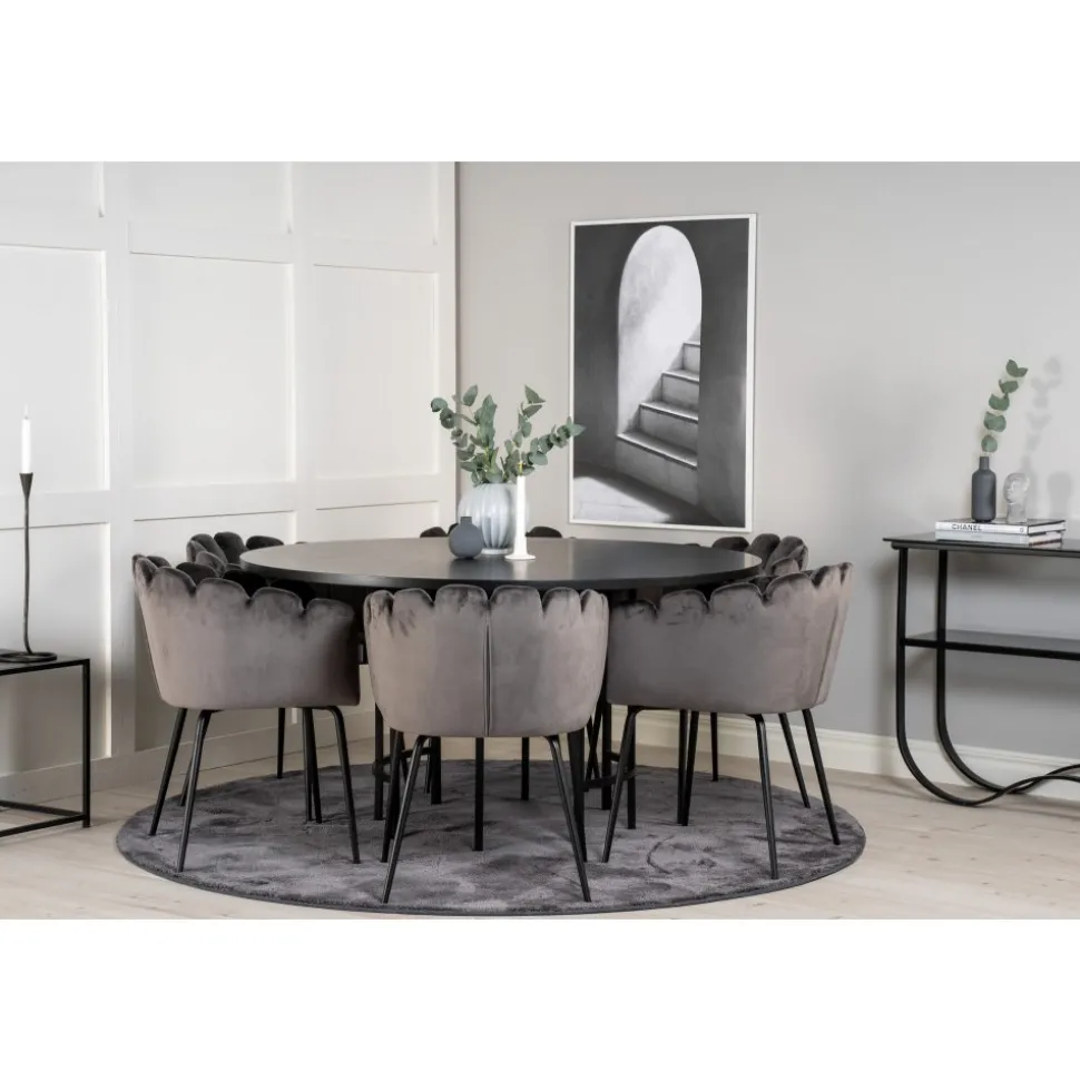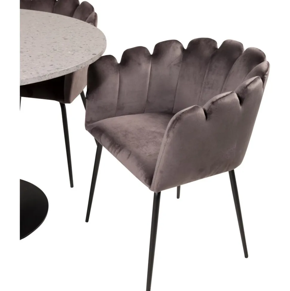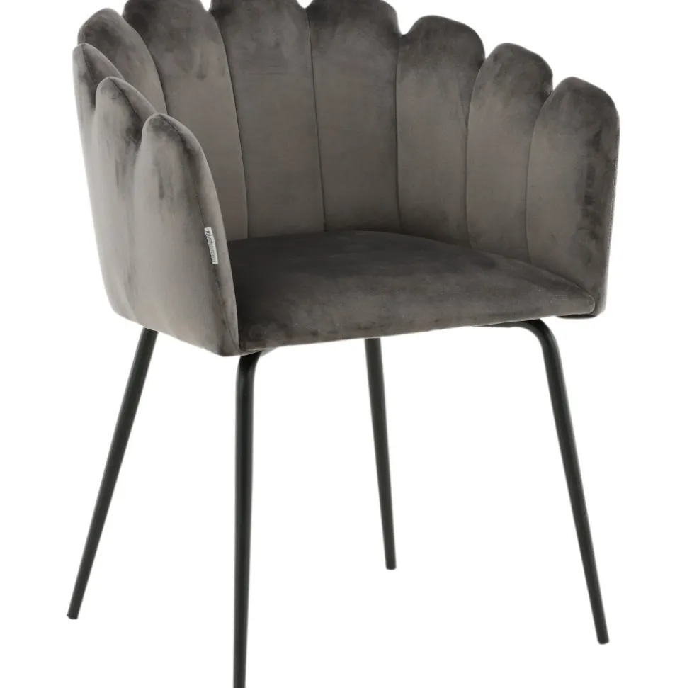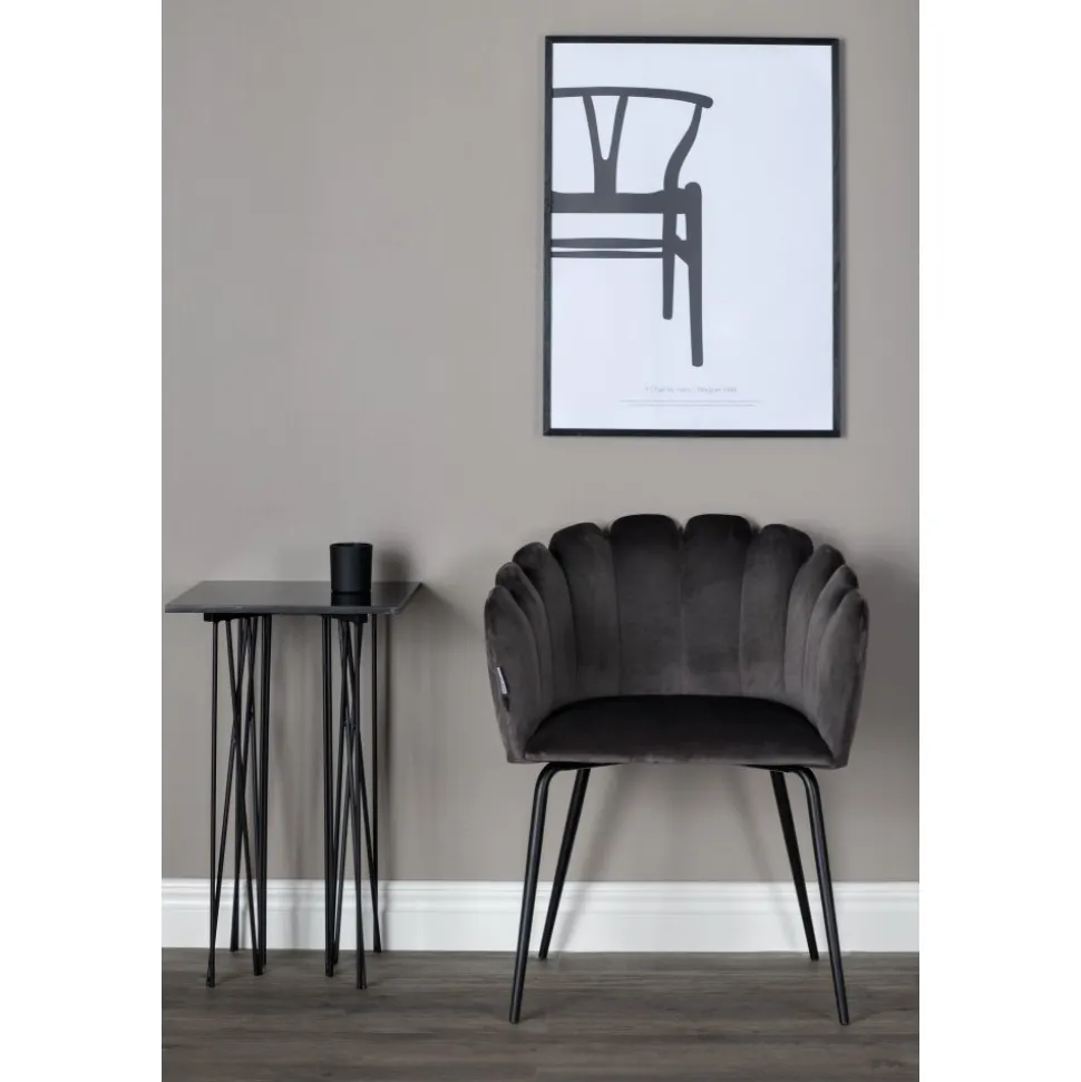 Karmstol av metall och plywood, klädd med polyestertyg.