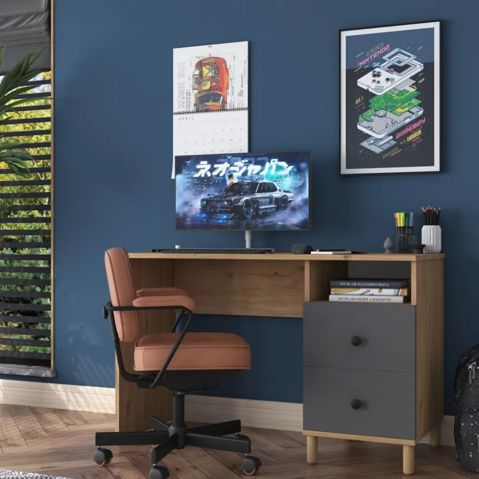 Skrivbord av melaminbelagd spånskiva.