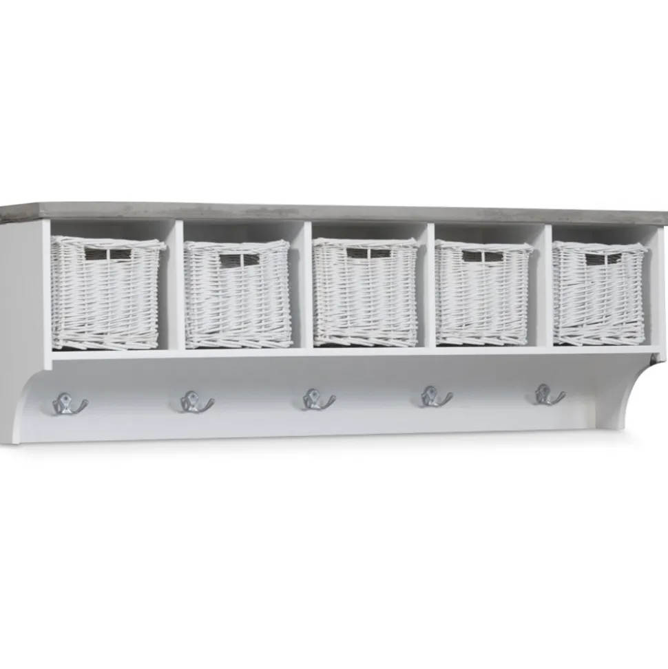 Hatthylla i vitt trä med fem klädkrokar som ingår. Robust design med toppskiva av ett ytskickt av microcement för att ge känslan av massiv cementskiva.
