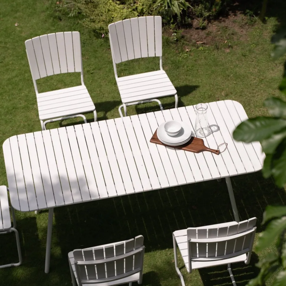 Utegruppen består av ett nätt rektangulärt bord 180×80 cm med tillhörande 6 st stolar.