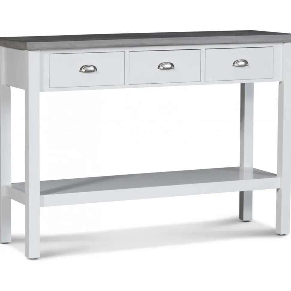 Hugo avlastningsbord med 3 lådor 110×36 cm – Vit / Cement + Fläckborttagare för möbler