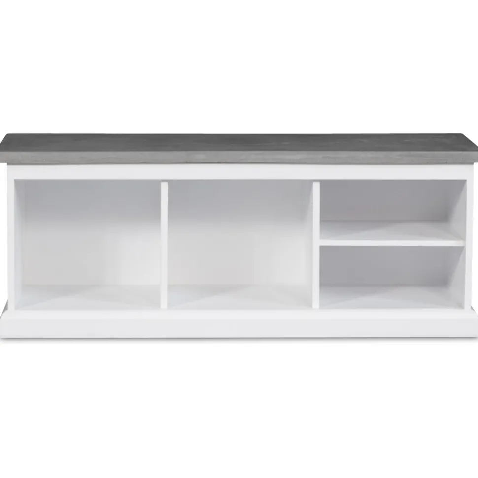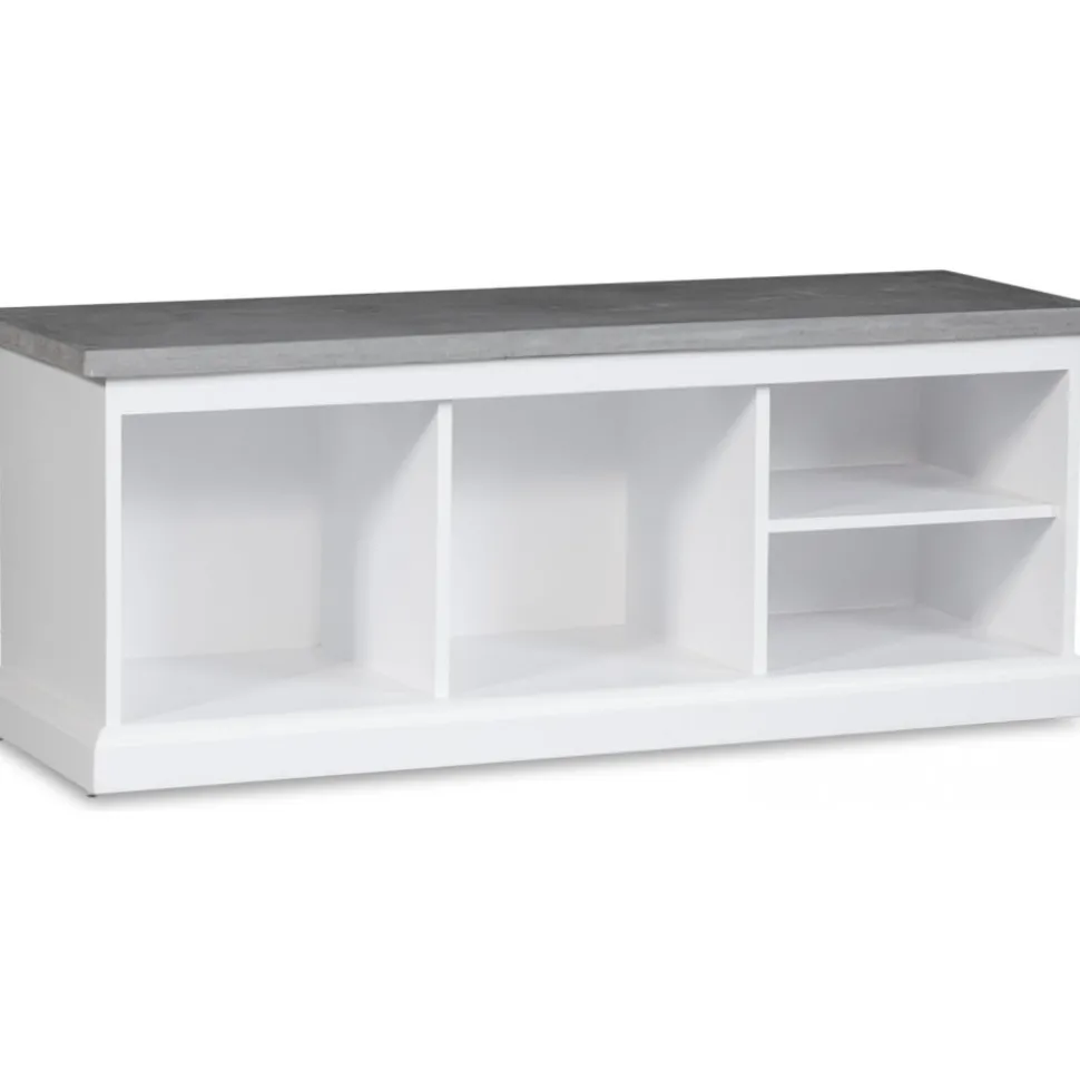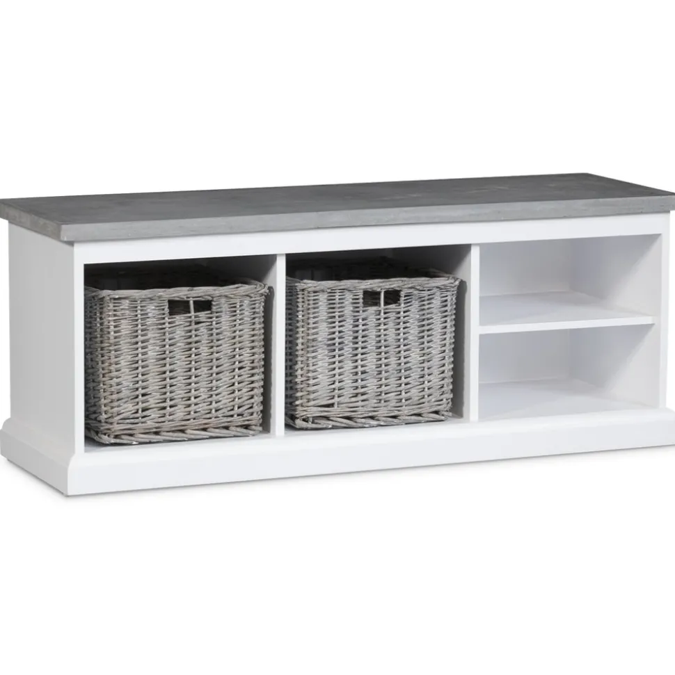 Hallbänk i vitlackat trä. Robust design med toppskiva av ett ytskickt av microcement för att ge känslan av massiv cementskiva.. Två större förvaringsutrymmen och två smalare förvaringsutrymmen. Köp till Hugo förvaringskorgar. Skobänk.