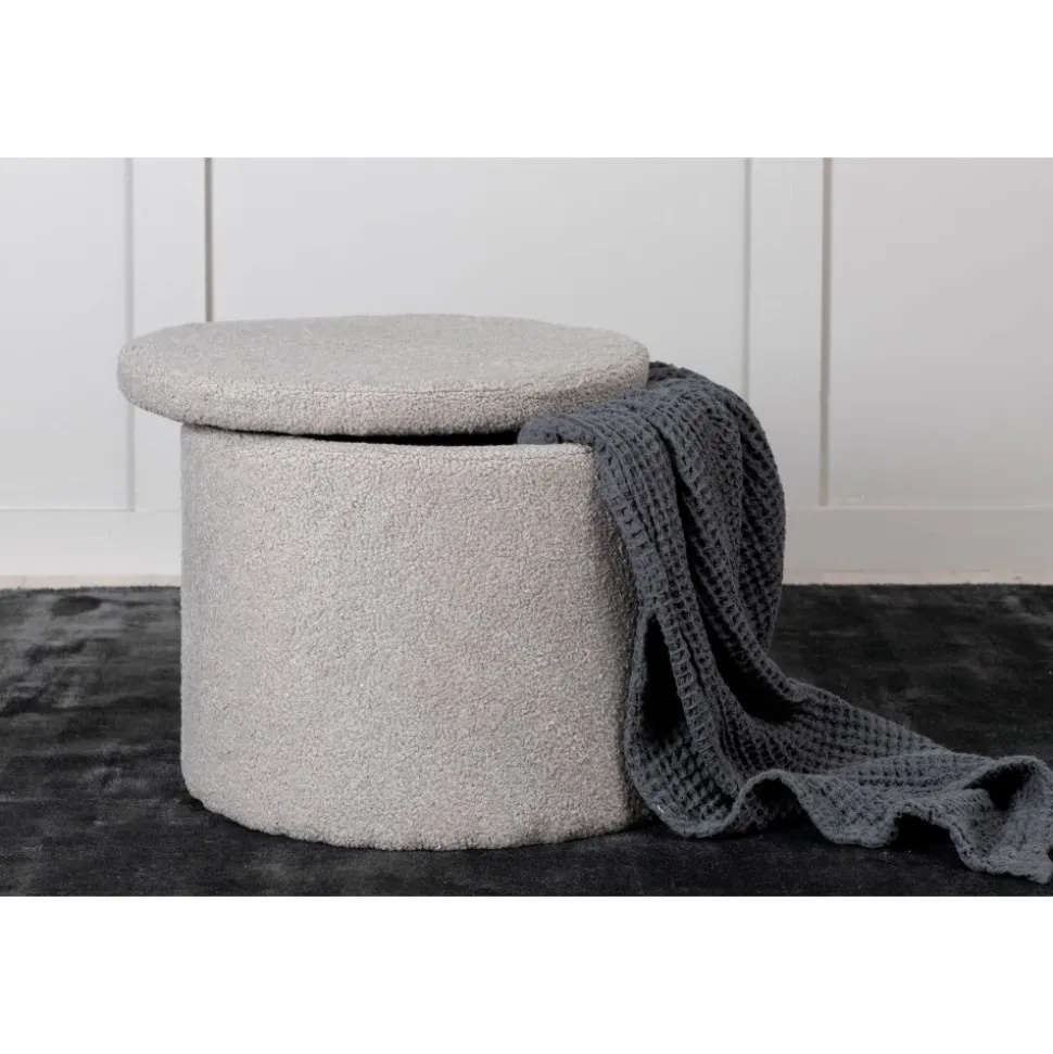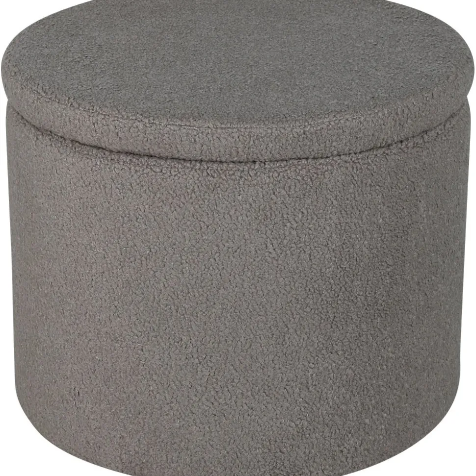 Sittpuff av trä och stål, klädd med polyestertyg.