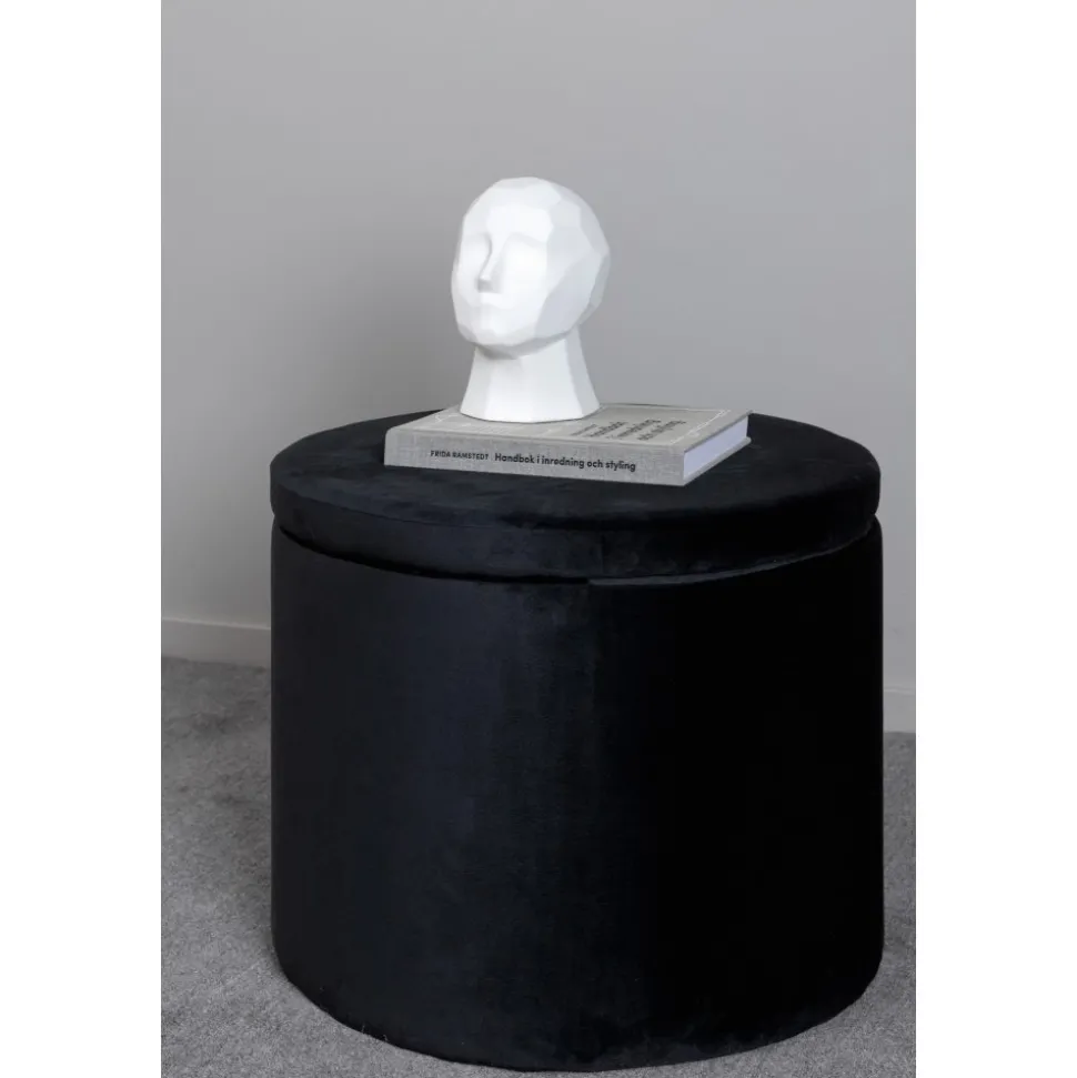 Sittpuff av trä och stål, klädd med polyestertyg.
