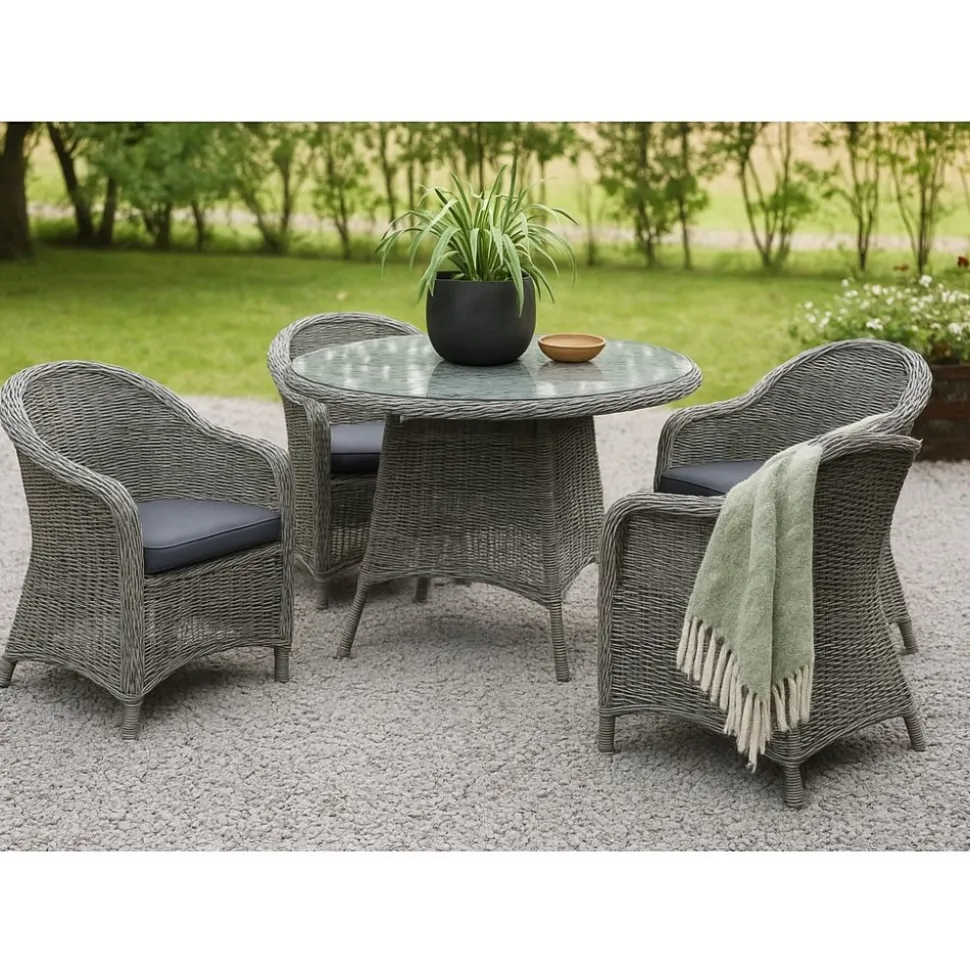 Matgrupp innehållande 1 st runt matbord i grå konstrotting med härdat glas som toppskiva, inklusive 4 st Mercury fåtöljer i matchande grå konstrotting med sittdyna och ryggdyna för bästa komfort. Matgruppen passar perfekt på altanen, uteplatsen och i uterummet.