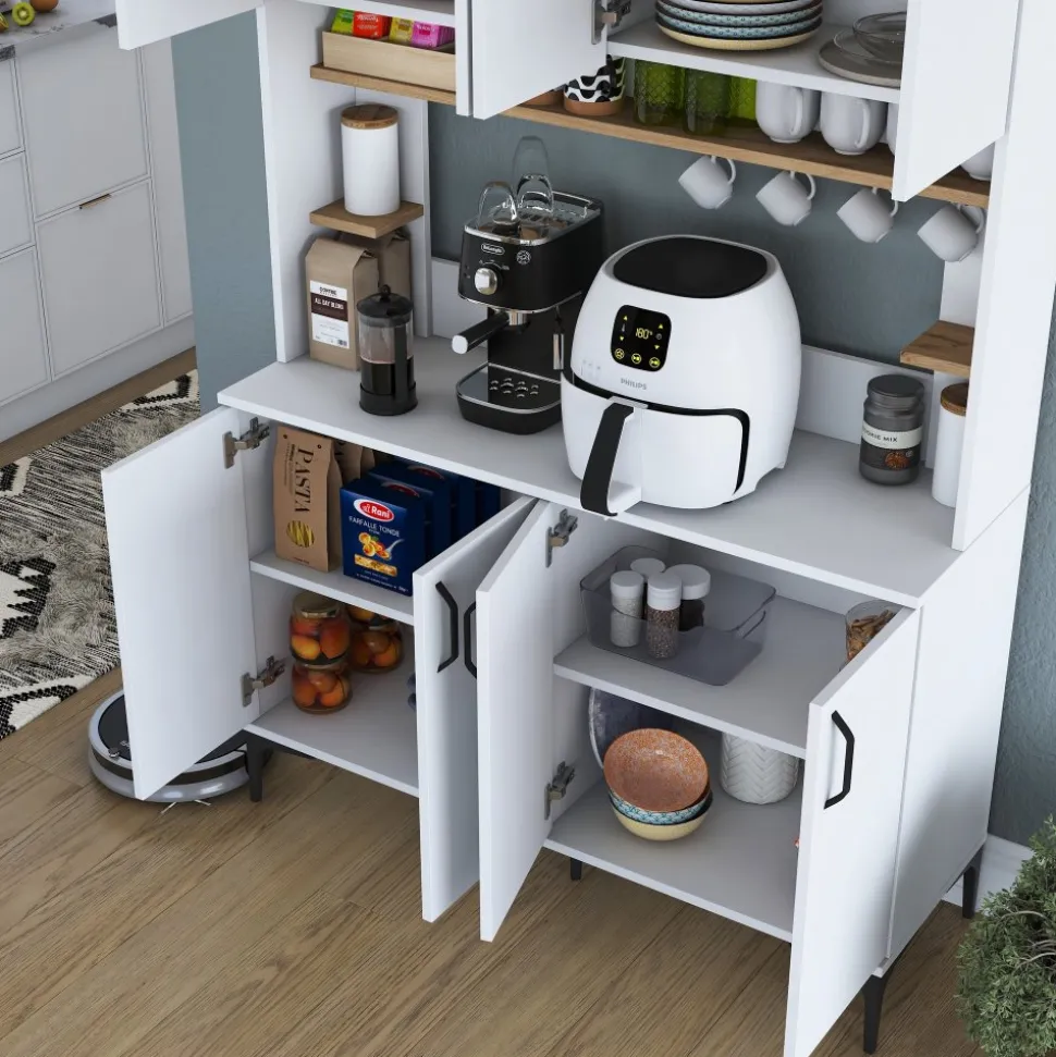 Köksskåp av melaminbelagd spånskiva.