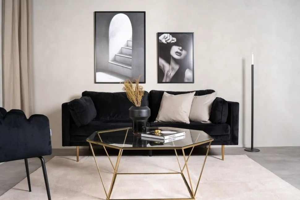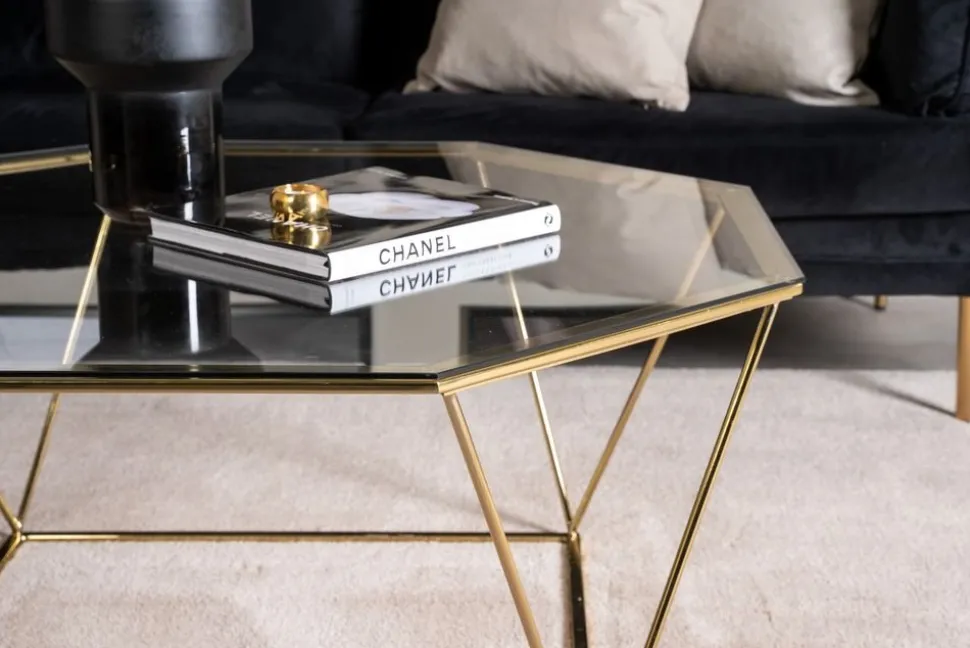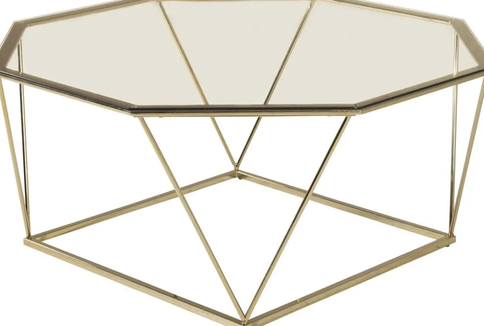 Mångsidigt med toppskiva av glas och tunn ram av mässingsfärgad metall.