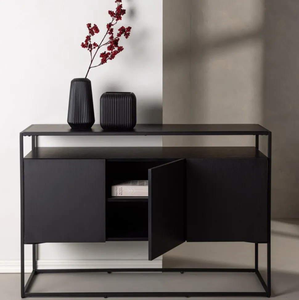 Avlastningsbordet som möjliggör både dold och synlig förvaring och är lika praktiskt som stilsäkert! Tack vare den generösa storleken och tre hyllplan finns det rymligt med plats åt all möjlig sorts förvaring som behöver placeras smart och stiligt. Tillverkad i svart MDF med en svart ramställning i stål. Den minimalistiska ramen ger ett stilrent intryck och möjliggör även enkel dammsugning. Pryd bordsskivan med vackra dekorationer och ljusstakar och fyll byrån med allt du önskar få plats med! Levereras omonterad.