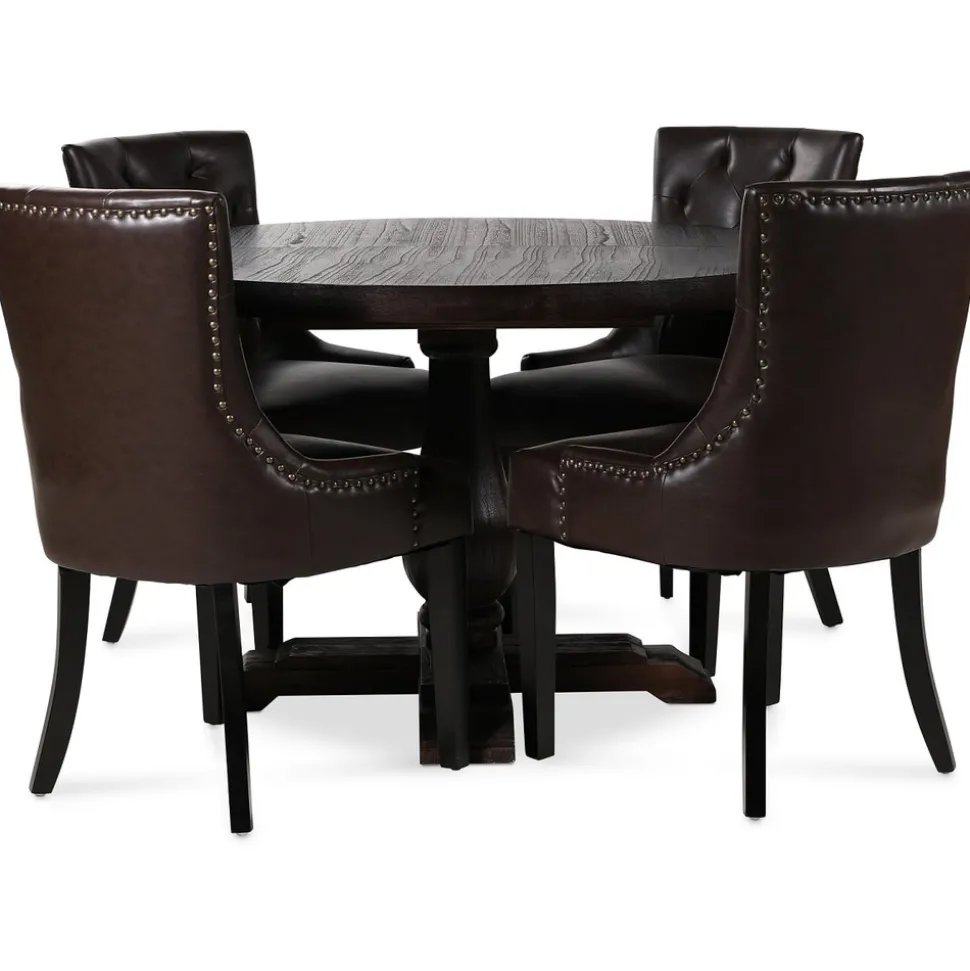 Medföljer gör också 4 st Tuva stolar i ett vintage brunt PU med antikfärgade nitar som en fräck detalj. Stolen är välarbetad och en av våra mest populära matstolar till Vintage-stilen.