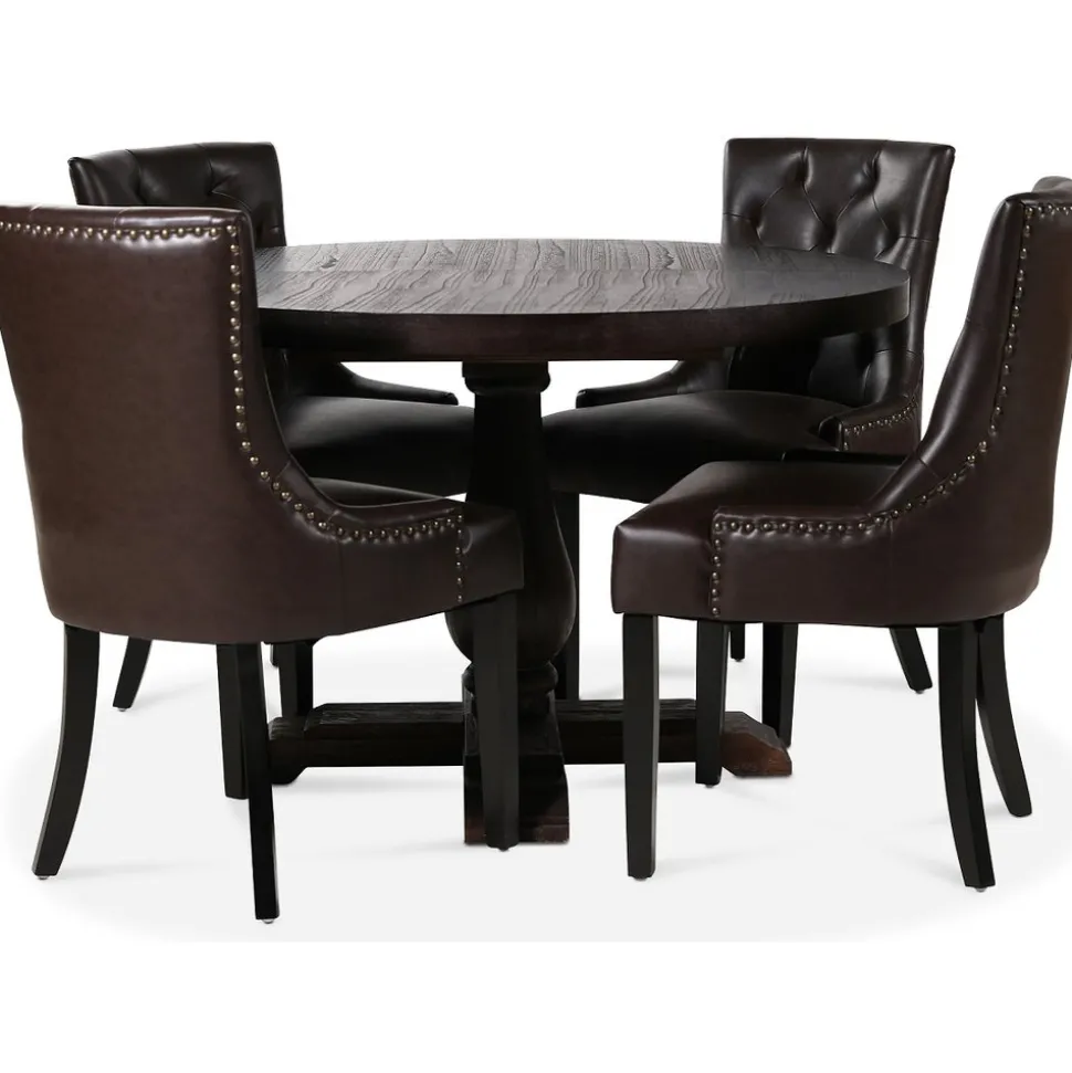 Medföljer gör också 4 st Tuva stolar i ett vintage brunt PU med antikfärgade nitar som en fräck detalj. Stolen är välarbetad och en av våra mest populära matstolar till Vintage-stilen.