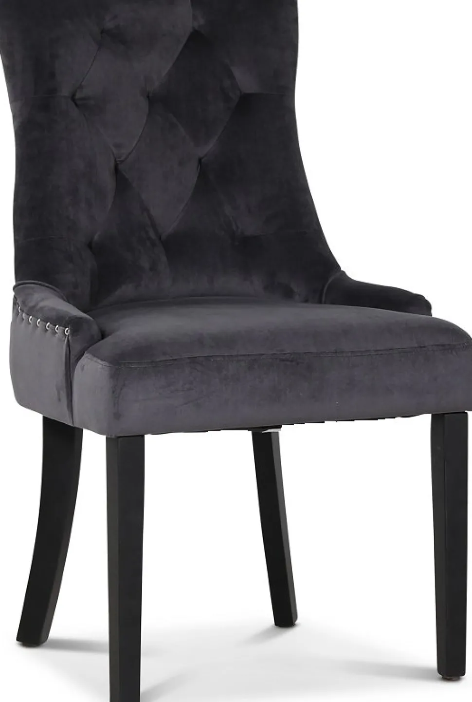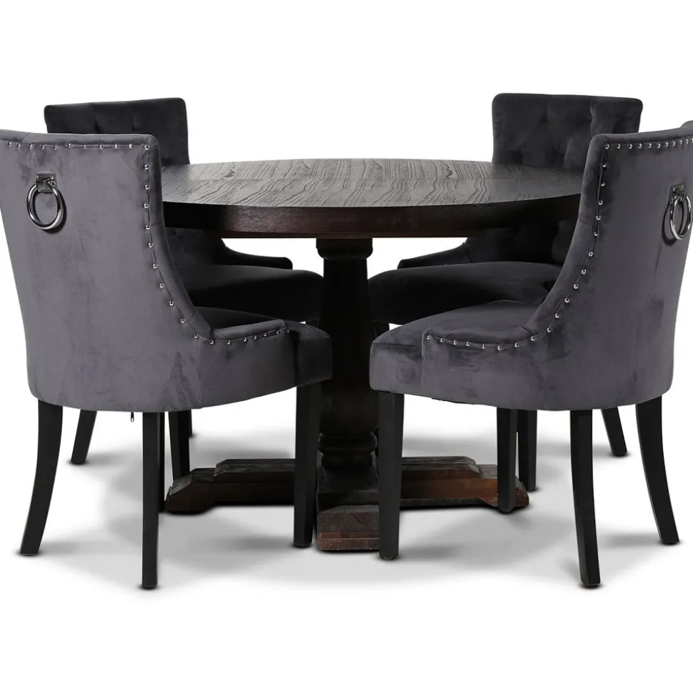 Medföljer gör också 4 st Tuva stolar i ett mjukt grått sammetstyg tyg med kromade nitar och ett rygghandtag som en fräck detalj. Stolen är välarbetad och en av våra mest populära matstolar till Vintage-stilen.