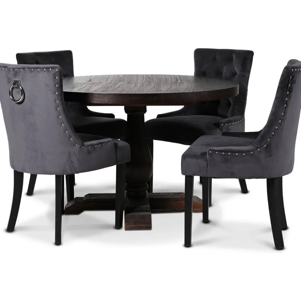 Medföljer gör också 4 st Tuva stolar i ett mjukt grått sammetstyg tyg med kromade nitar och ett rygghandtag som en fräck detalj. Stolen är välarbetad och en av våra mest populära matstolar till Vintage-stilen.