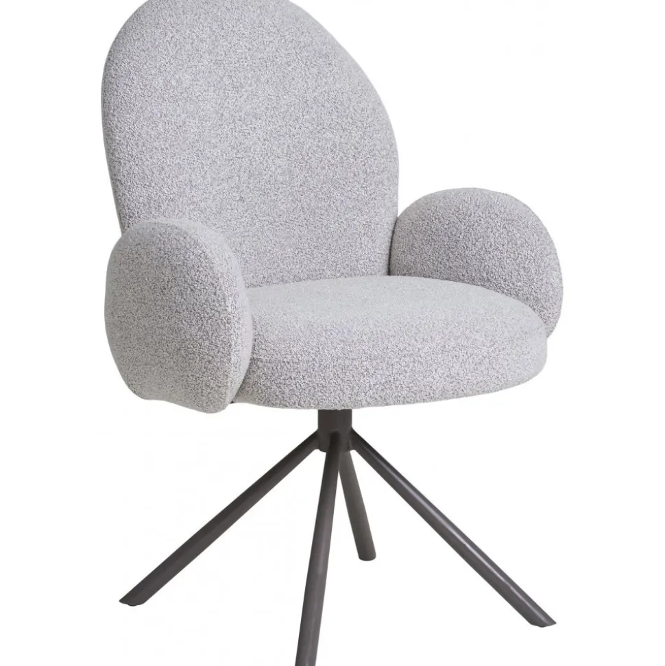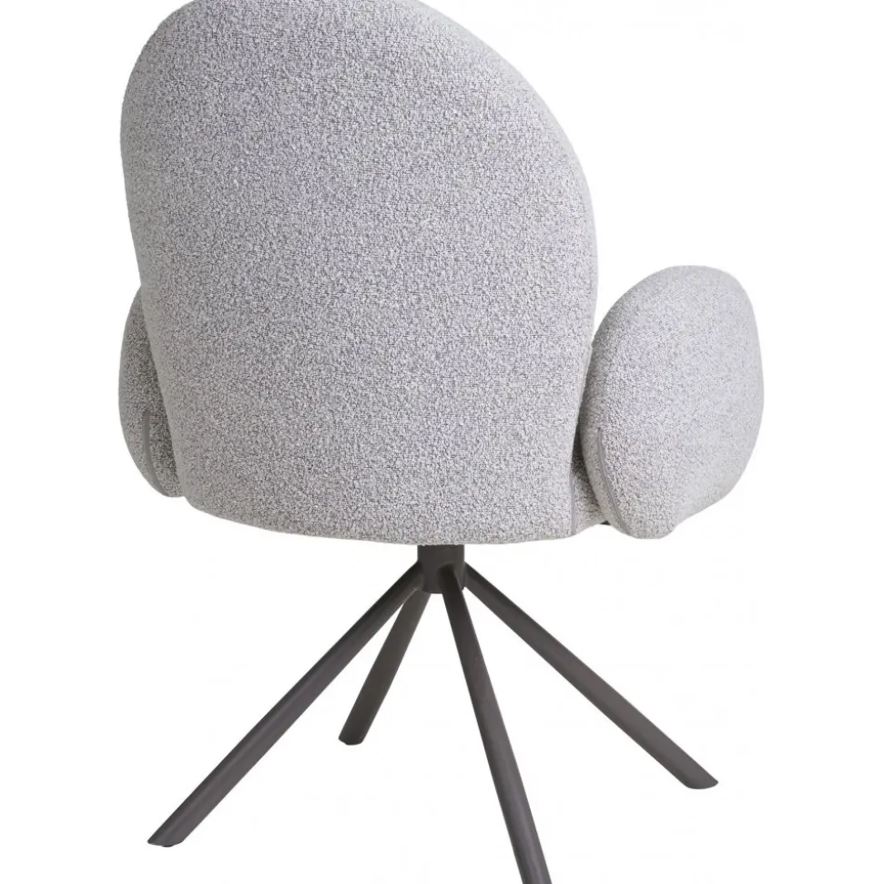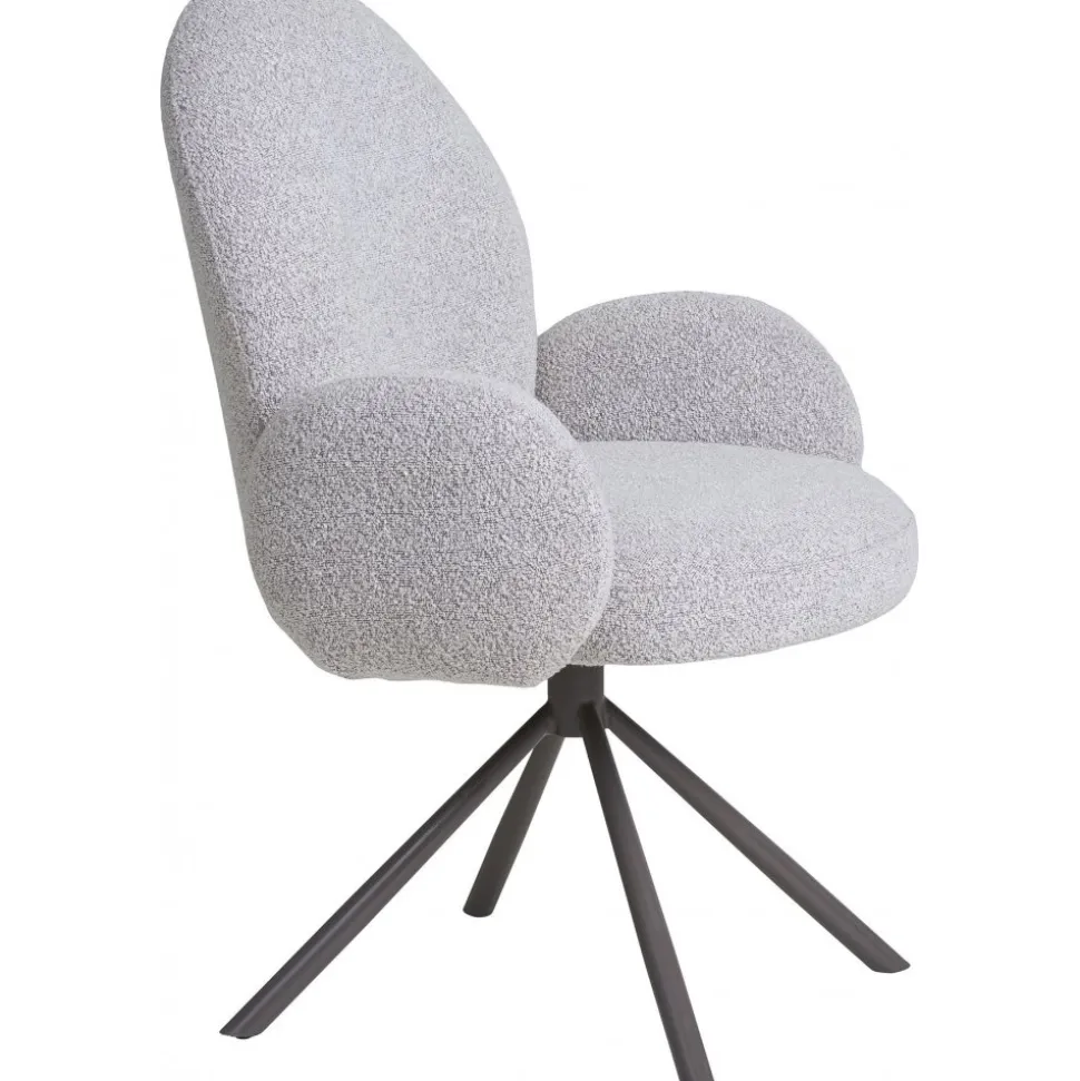 Karmstol av plywood med klädsel av bouclétyg och ben av stål. Levereras omonterad.