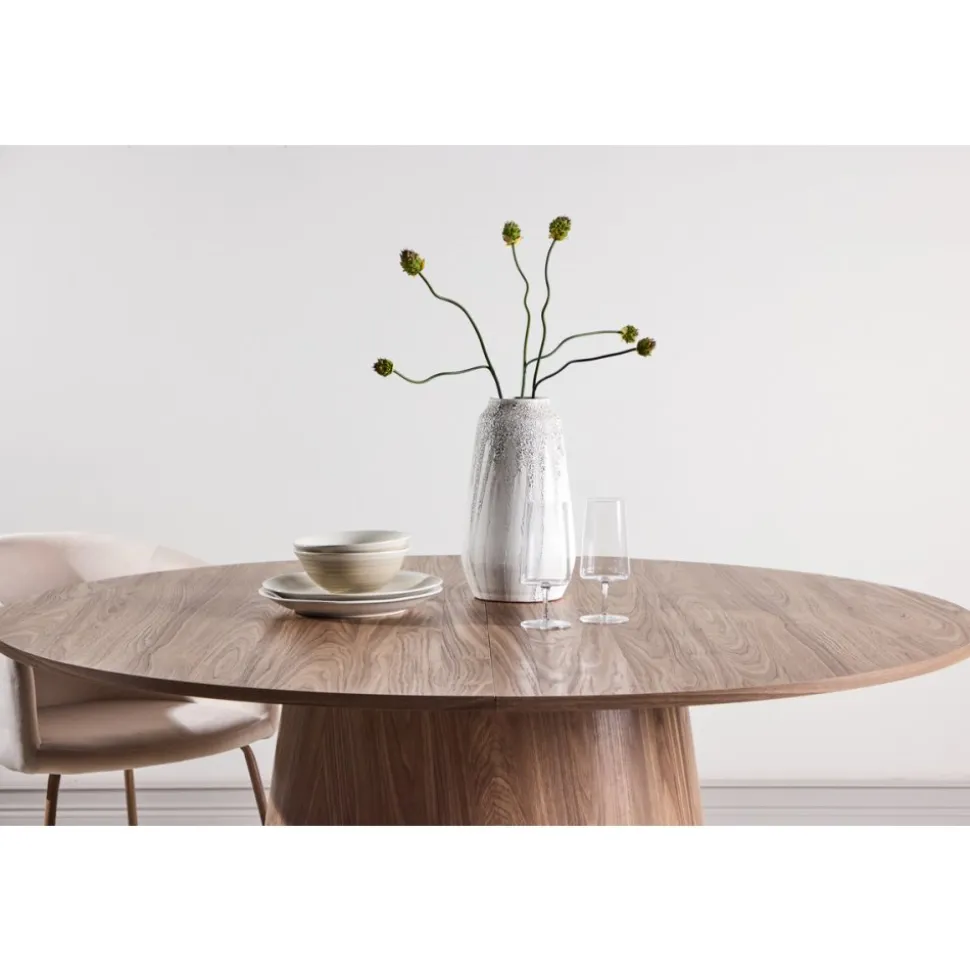 Matbord LANZO imponerar med sin Skandinaviska design och smakfulla utformning. Bordet har en genomgående helhetsdesign i MDF med en tunn, rund toppskiva och en vriden cylinderformad stomme som är centrerad under bordets mitt. Kulören är jordnära och synliggör materialets mönster som ger liv och rörelse till bordet. Skapa ett stilrent blickfång i hemmets hjärta – här hamnar ingen på kanten. Ytan efterliknar valnötsträ.