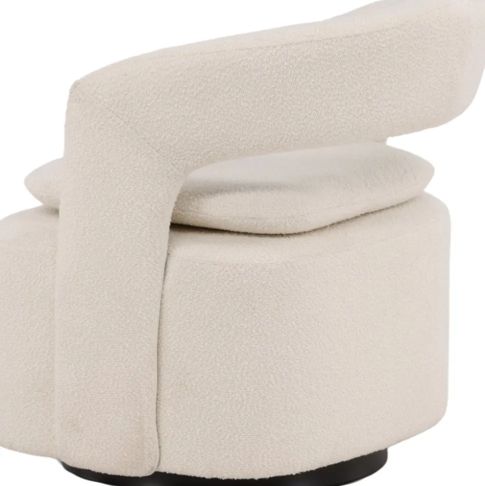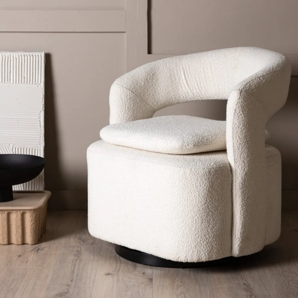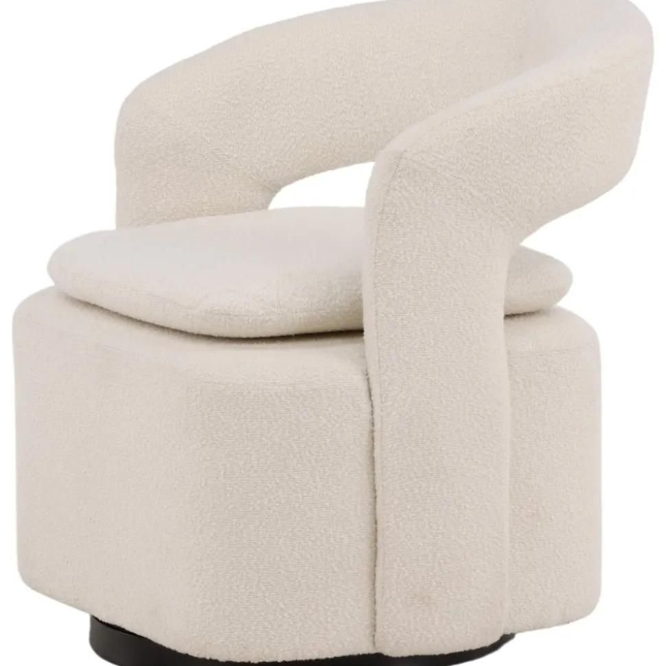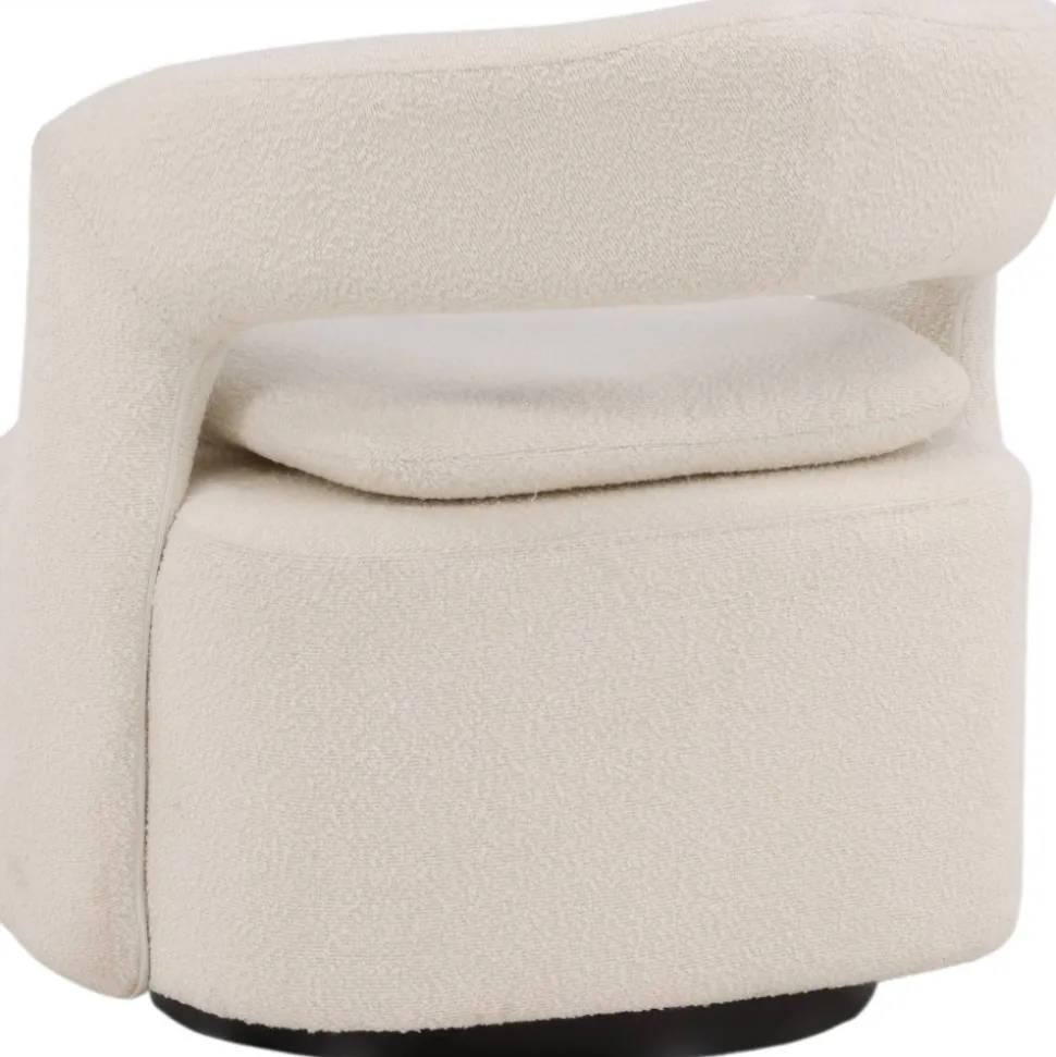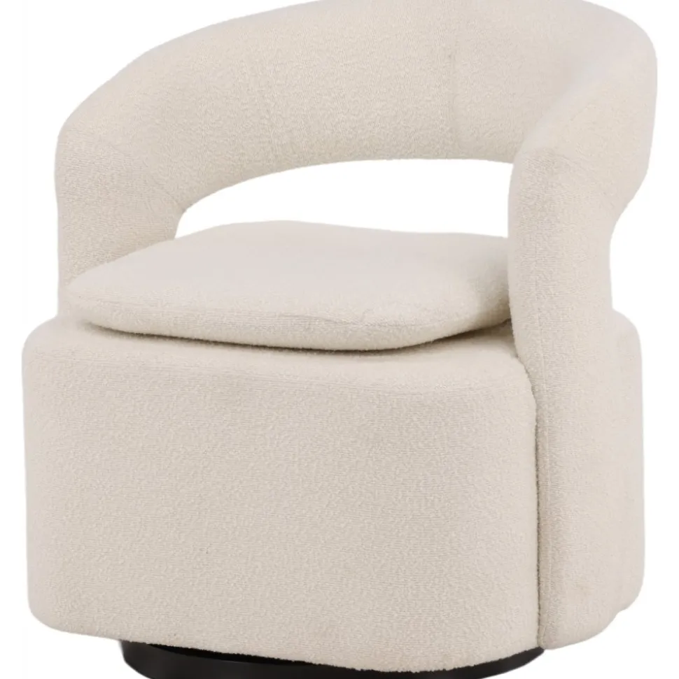 Den här moderna fåtöljen har en smakfull utformning, helklädd i vitt boucletyg. Den stora sittpuffen har en integrerad kudde på sittytan och ryggstödet är följsamt sammanhängande med sitsen. Fåtöljen har en snurrfunktion. Sitt bekvämt och njut av avkopplande stunder! Levereras omonterad.