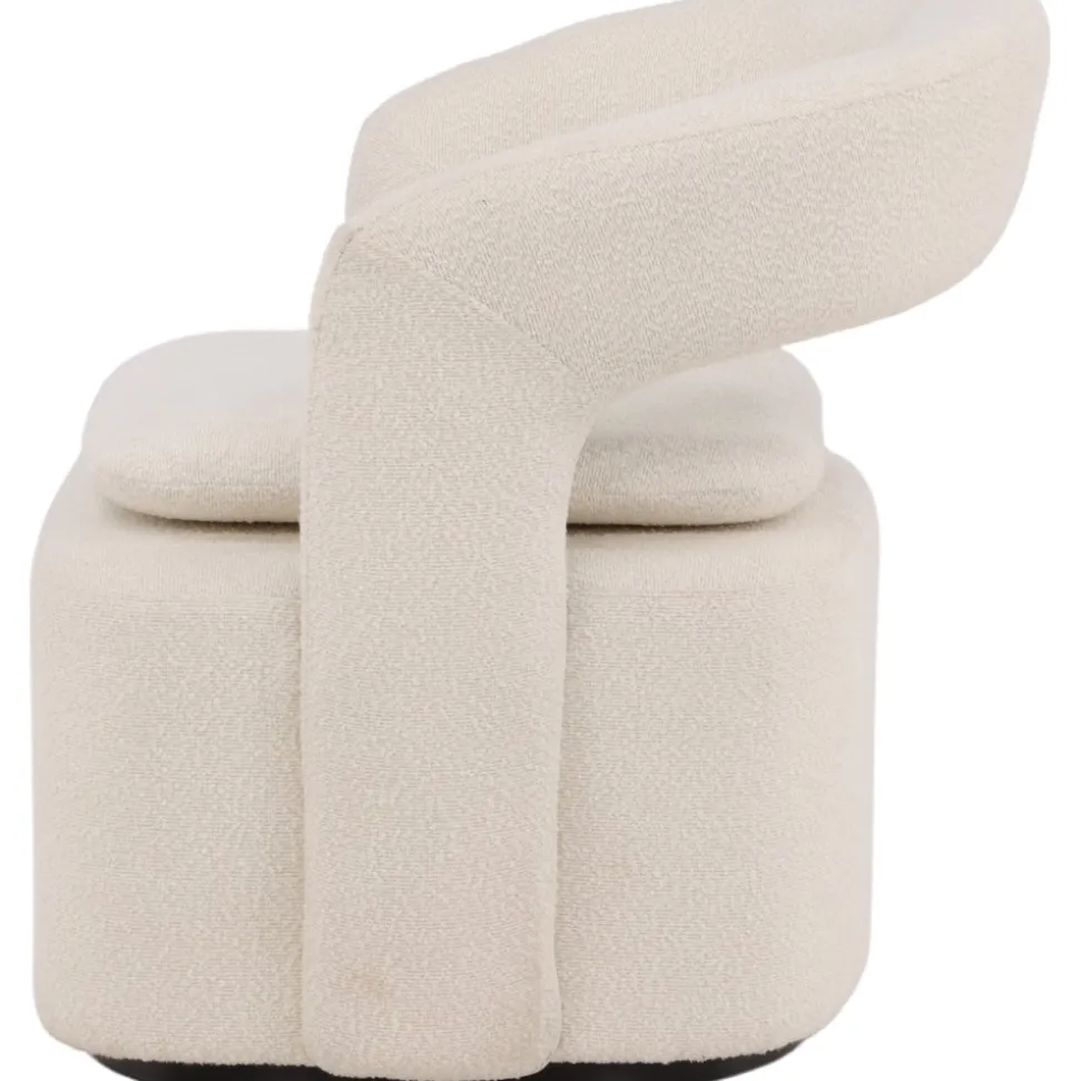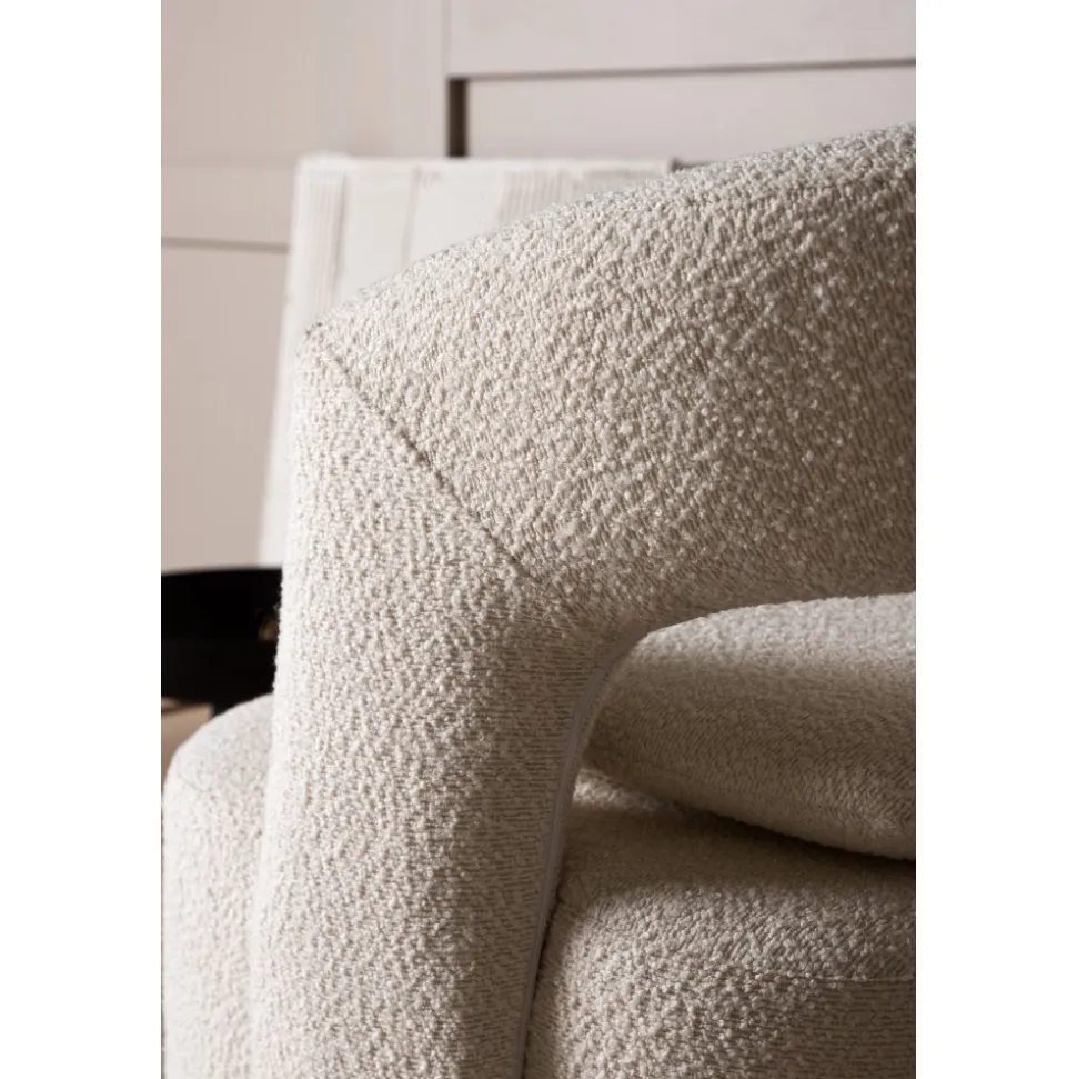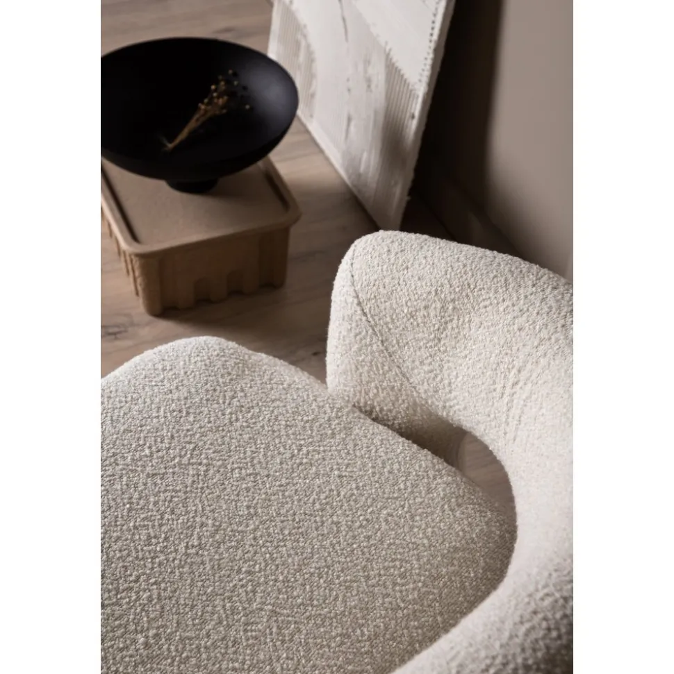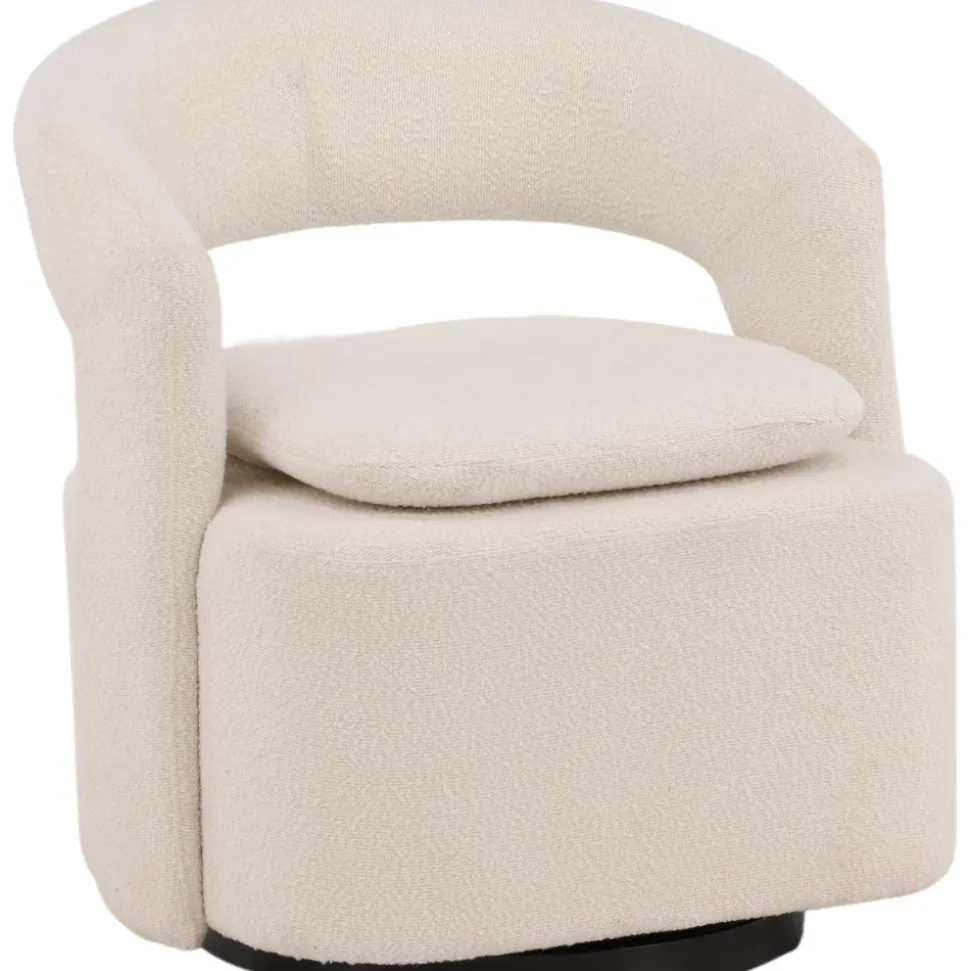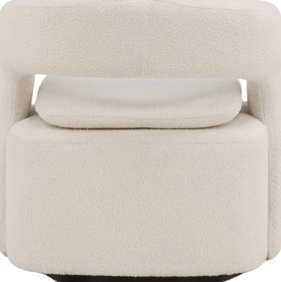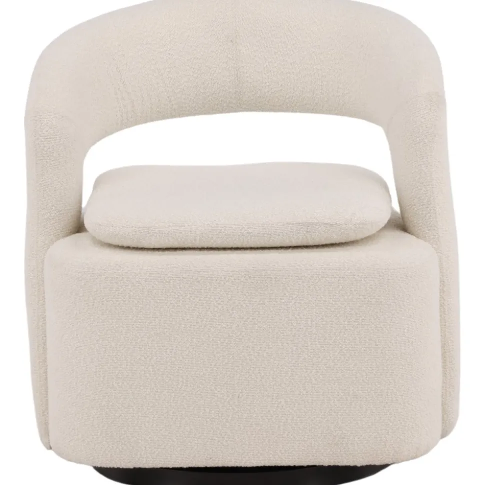 Den här moderna fåtöljen har en smakfull utformning, helklädd i vitt boucletyg. Den stora sittpuffen har en integrerad kudde på sittytan och ryggstödet är följsamt sammanhängande med sitsen. Fåtöljen har en snurrfunktion. Sitt bekvämt och njut av avkopplande stunder! Levereras omonterad.