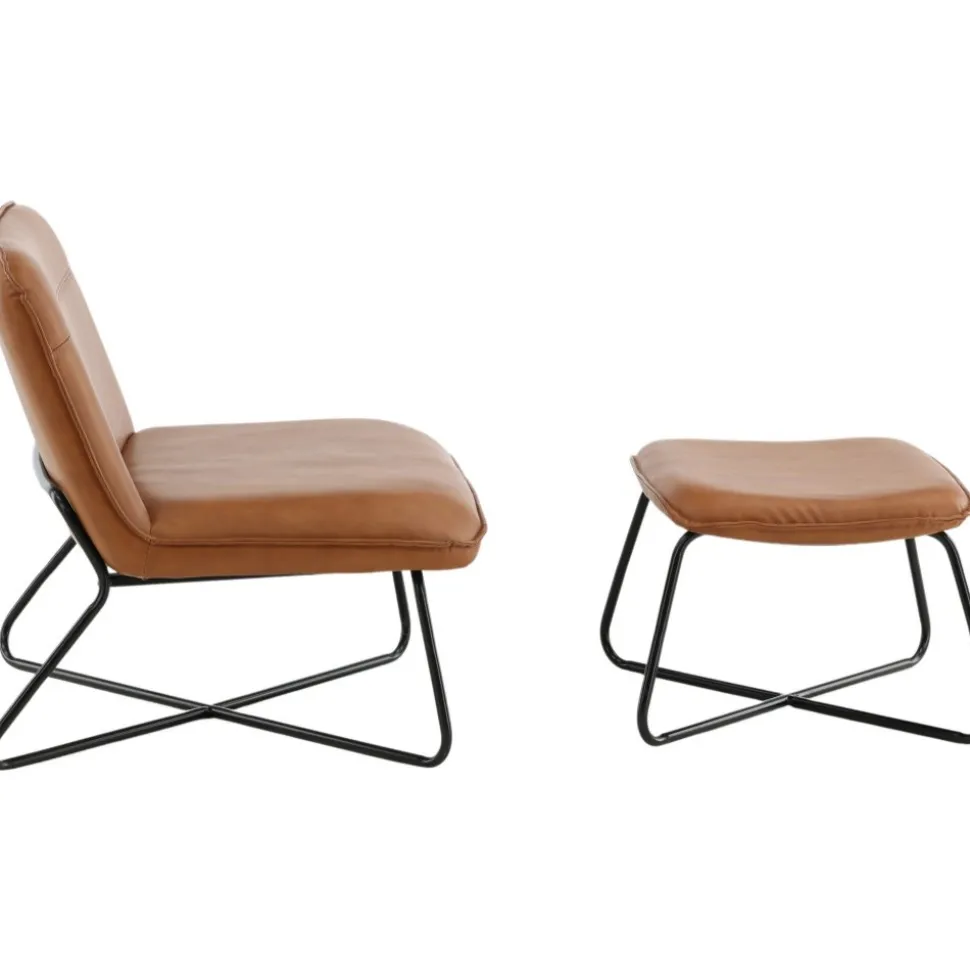 Fåtölj och fotpall av trä och järn, klädd med PU-läder.