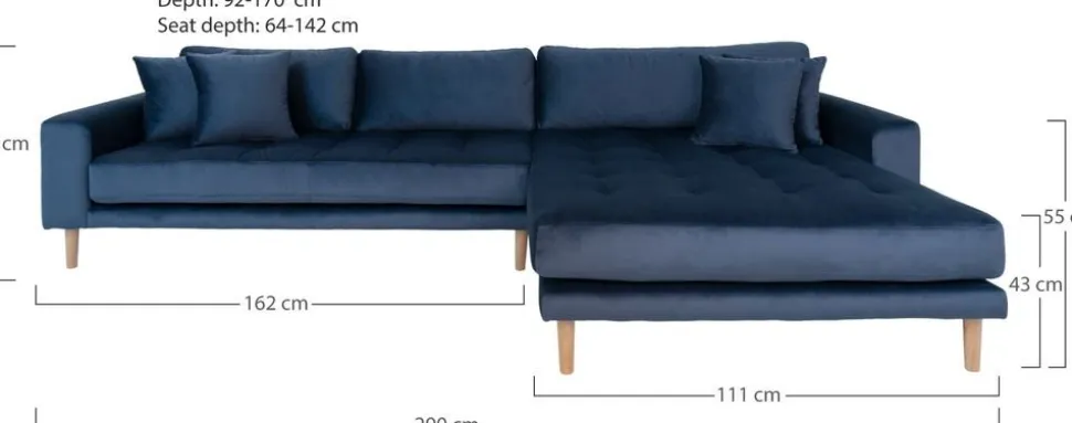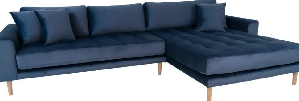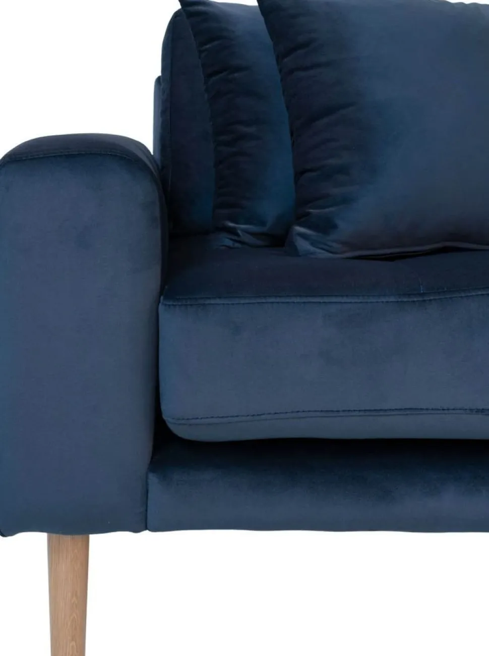 Högervänd i mörkblå velour. 4 st kuddar ingår.