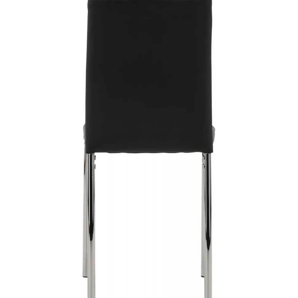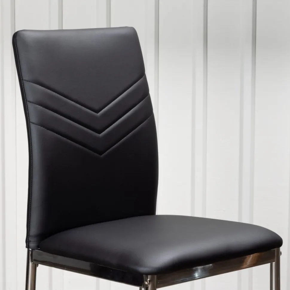 Matstol med skandinavisk design och raka nordiska former som står sig över tid. Sitsen är helklädd i svart konstläder och ryggen har dekorsömmar som blir till en snygg detalj. Stolsbenen är i kromat stål och ger en snygg industriell look till blickfånget. Sitt bekvämt och njut av trivsamma måltider framöver!