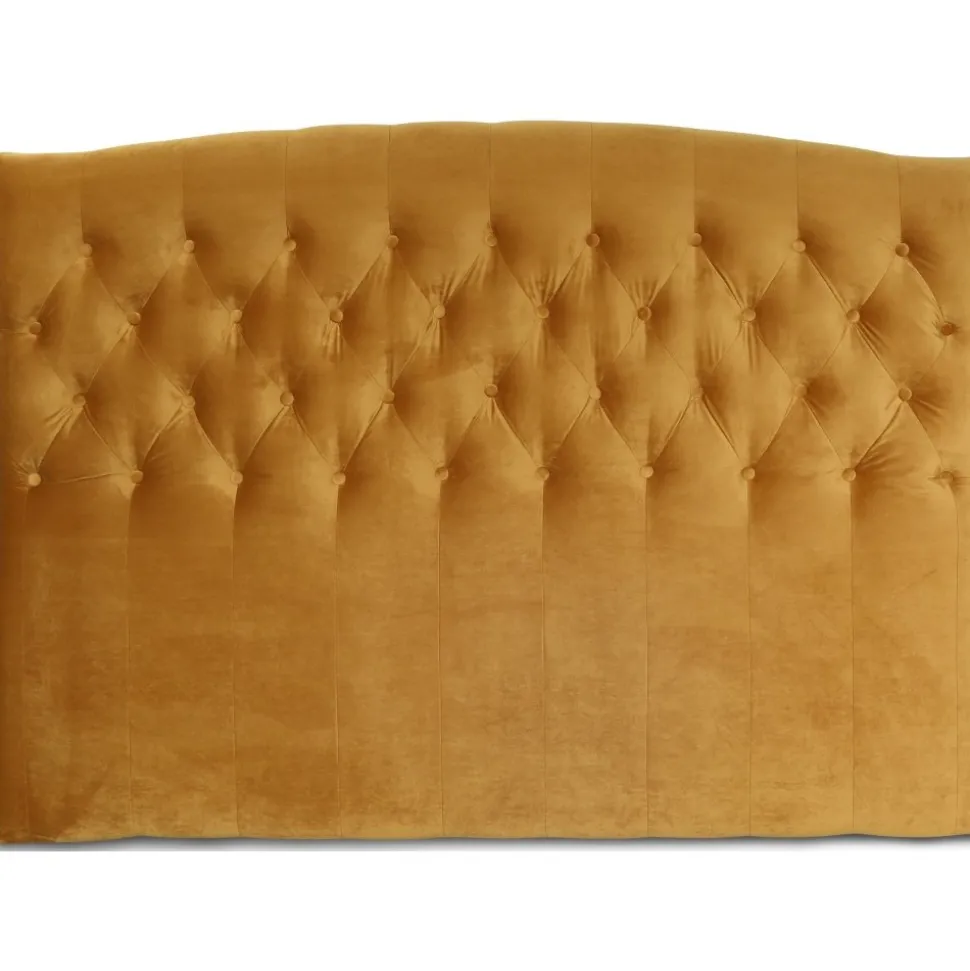 Sänggavel Love i ett guldfärgat sammetstyg med en mjuk känsla. Snygg design med djuphäftade knappar för att ge ett lyxigt utryck i sovrummet.