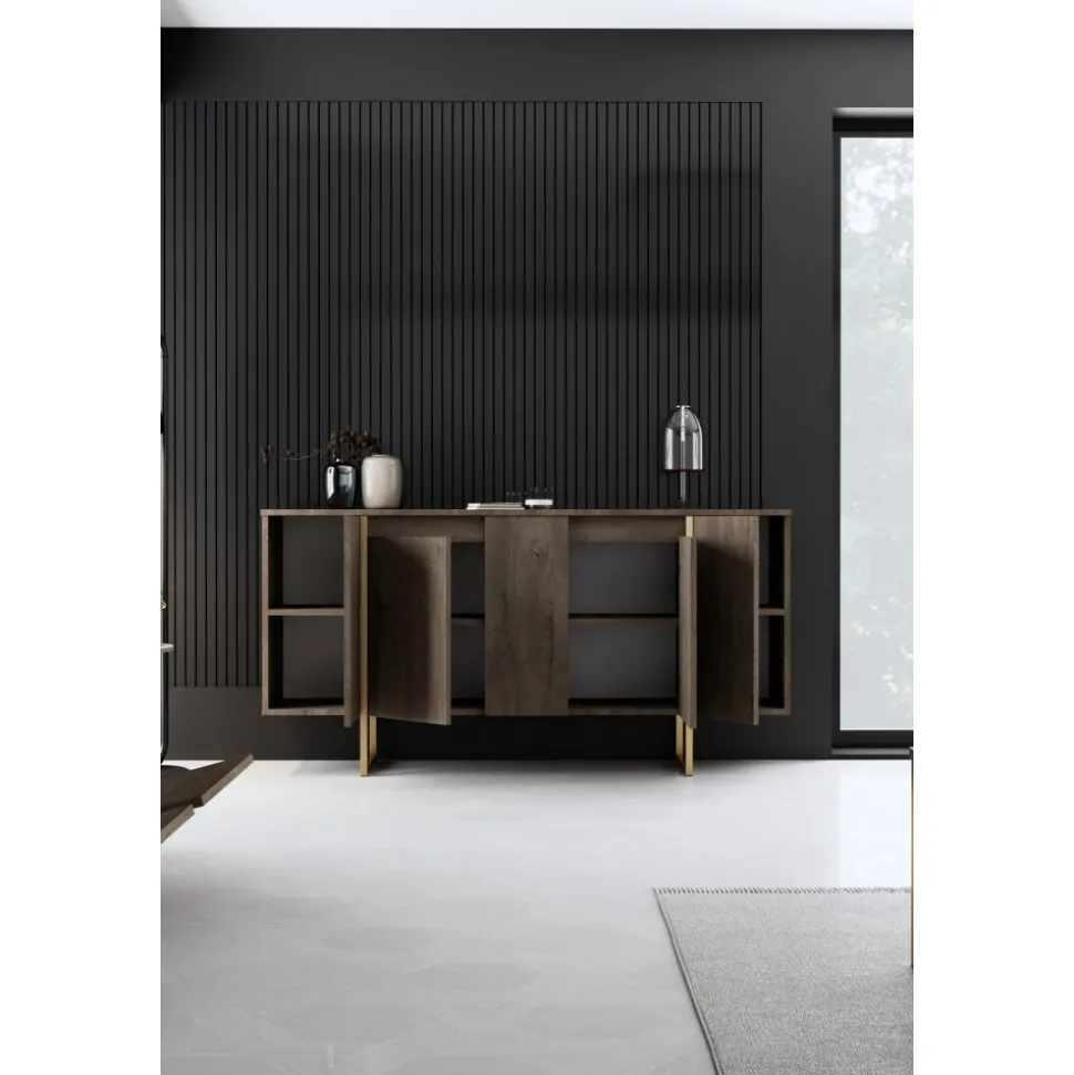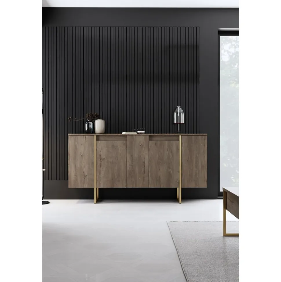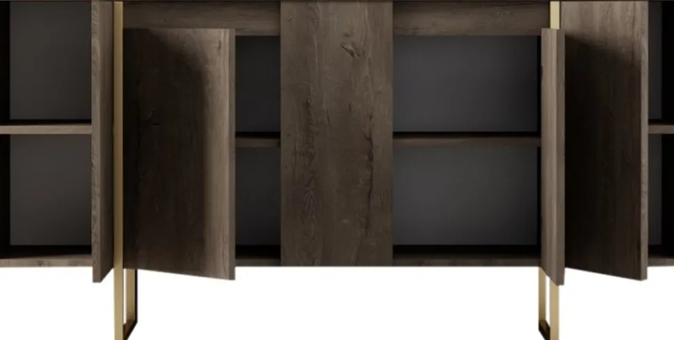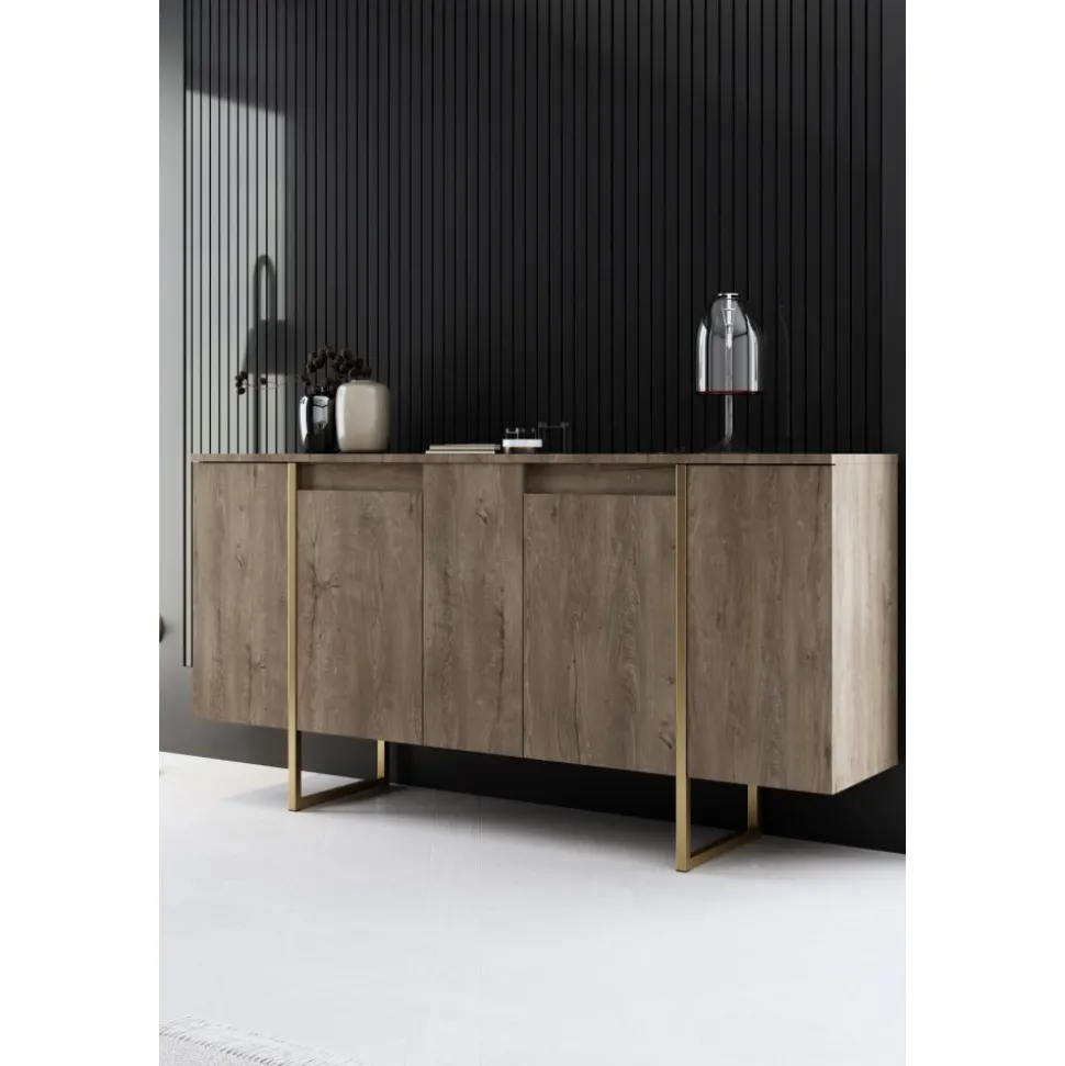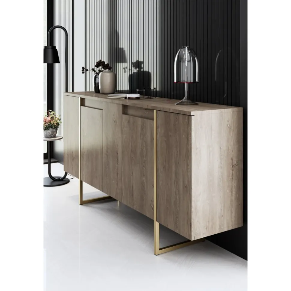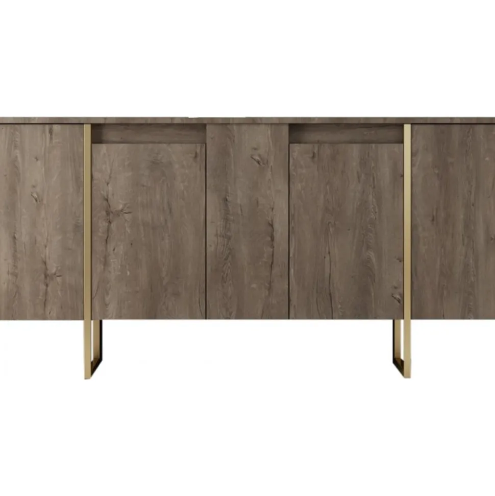 Skänk av spånskiva med ben av metall.