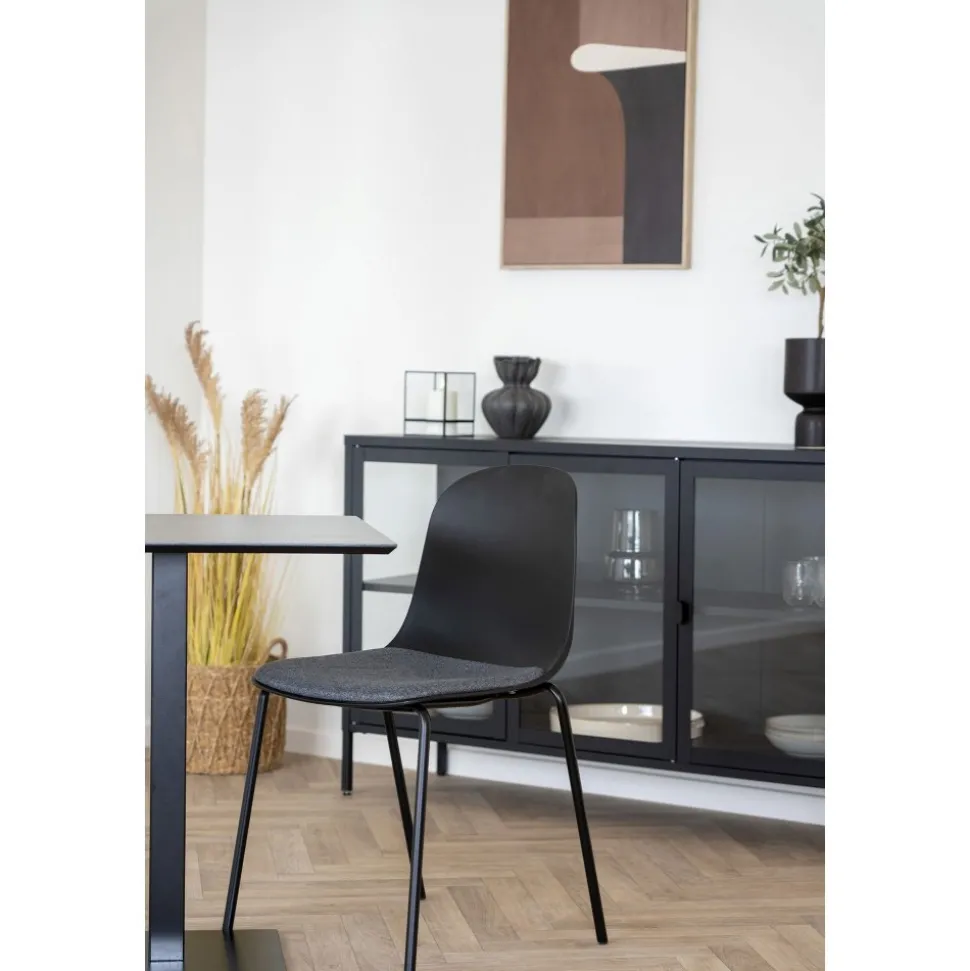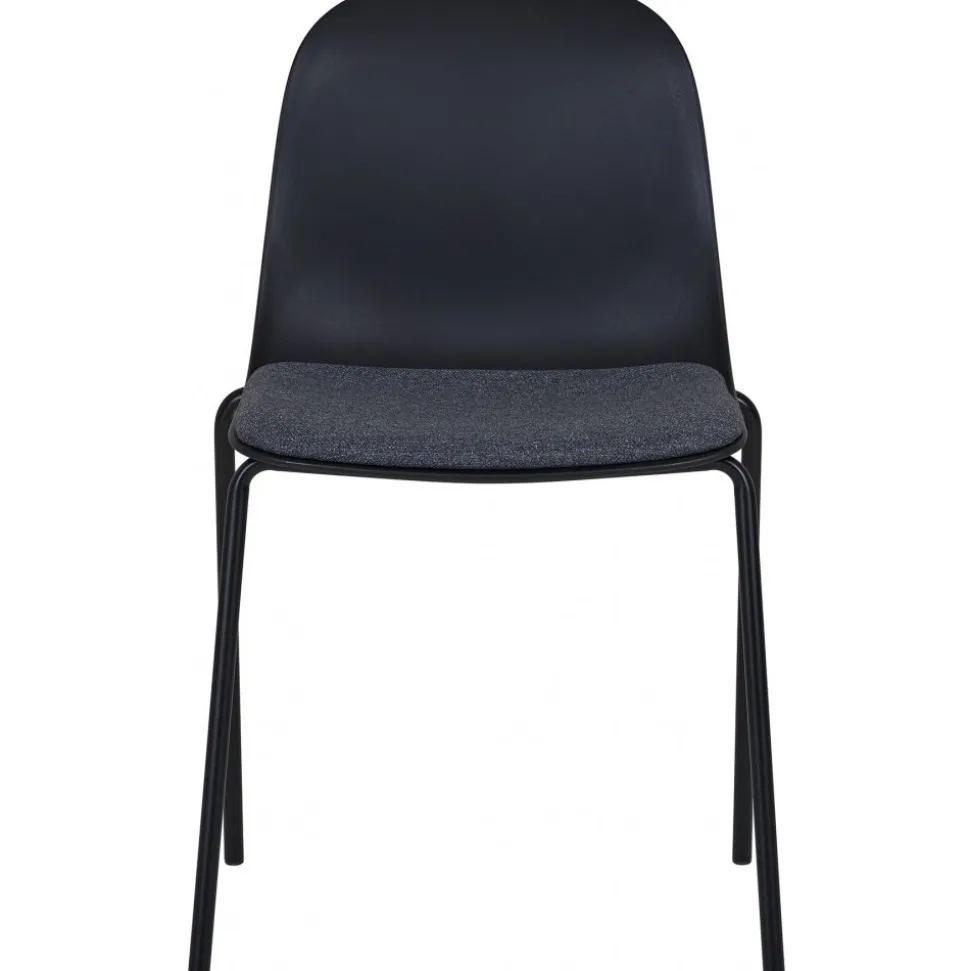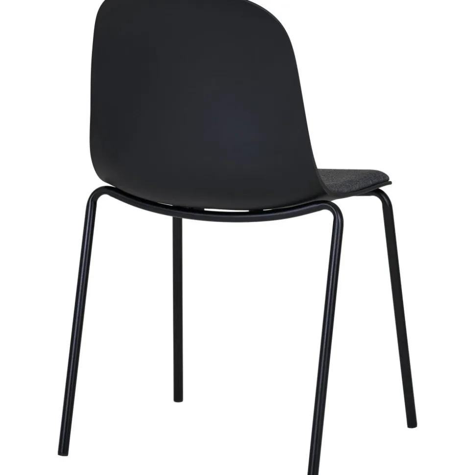 Matstol av plast och stål med sits i polyester. Levereras omonterad.