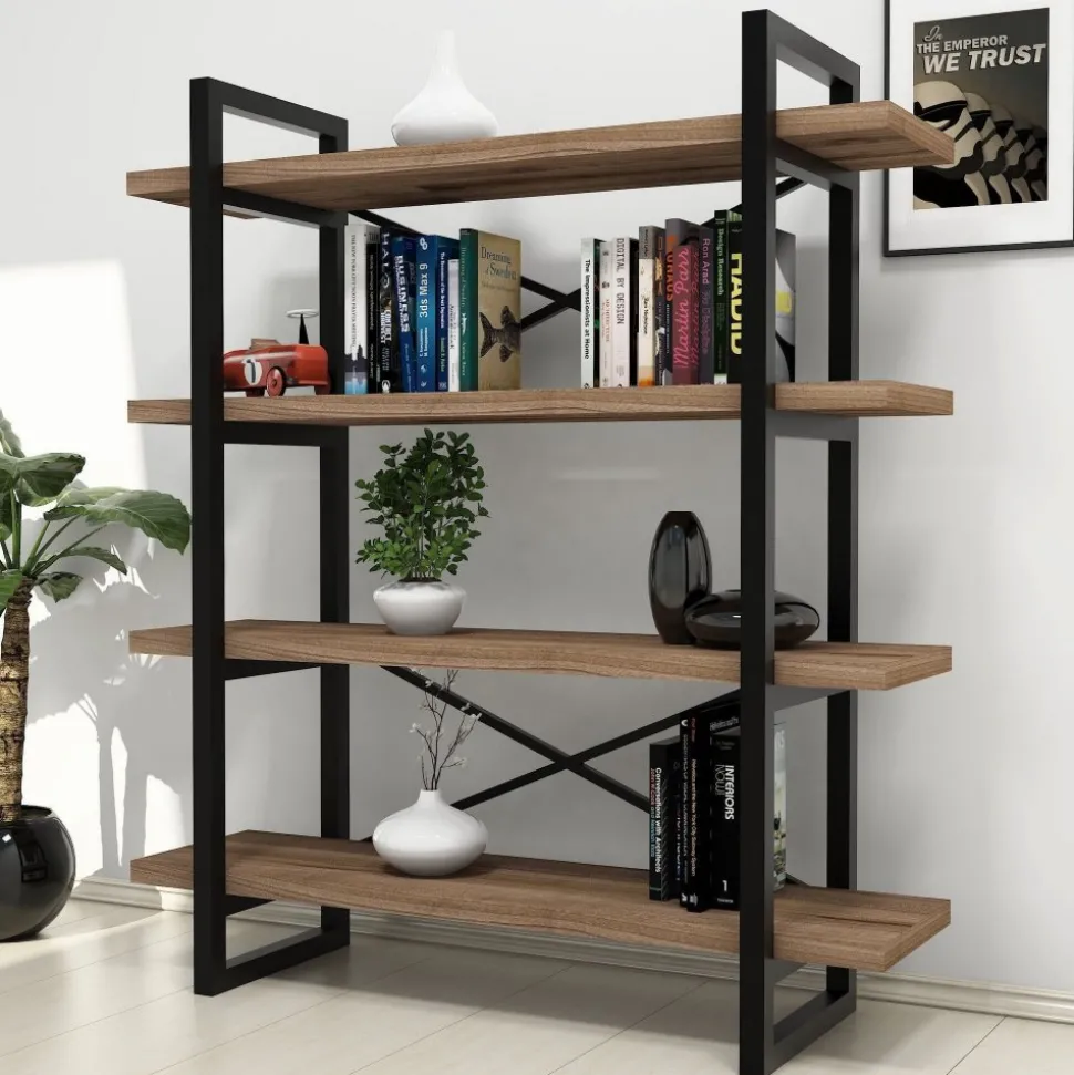 Bokhylla av trä och metall.