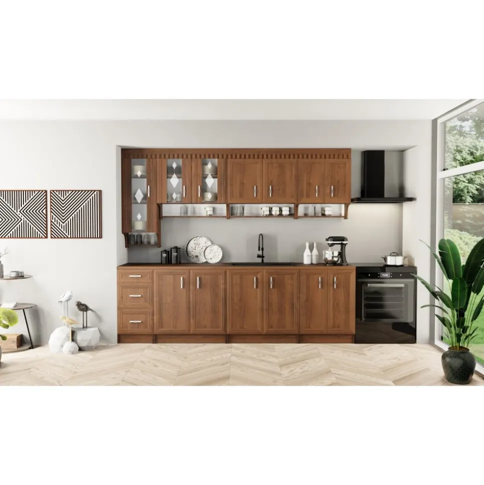 Med sin genomtänkta design erbjuder köket både estetik och funktionalitet. Den klassiska valnötsfinishen ger en tidlös charm som passar in i de flesta hem och miljöer. Här får du ett kök där du både kan arbeta effektivt och njuta av den vackra miljön.