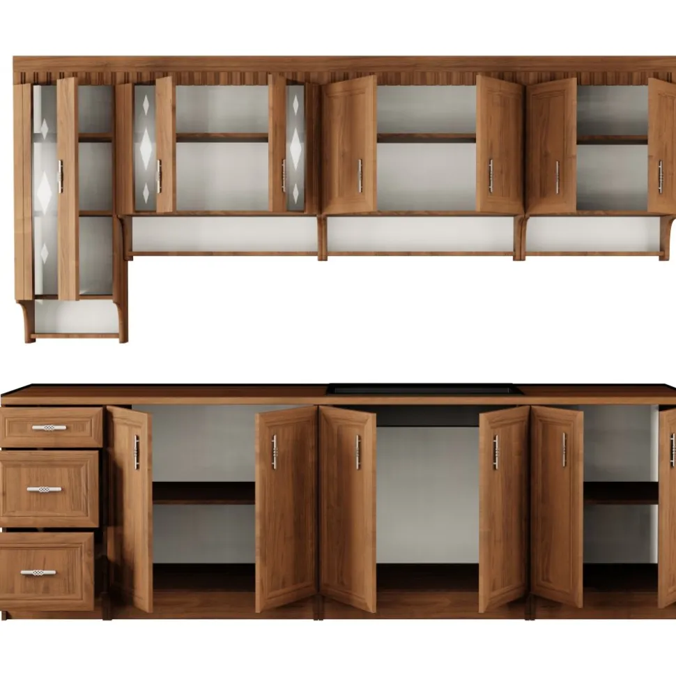 Köket är helt i valnöt, från fronten till stomme och bänkskiva. Den enhetliga valnötsfärgen ger ett varmt och inbjudande utseende, medan den 28 mm tjocka bänkskivan bidrar med både hållbarhet och en sofistikerad finish. Frontpanelerna är tillverkade i MDF för en jämn yta och långvarig hållbarhet.