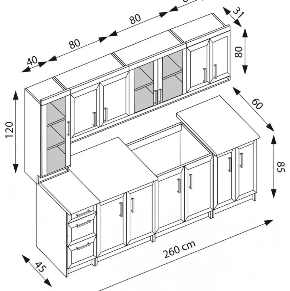 Margaret komplett kombinerar klassisk elegans med en tidlös traditionell design, och skapar en stilfull atmosfär i ditt hem. Med en total längd på 260 cm erbjuder köket generös arbetsyta och förvaringsutrymme, perfekt för både vardaglig användning och större matlagningstillfällen.