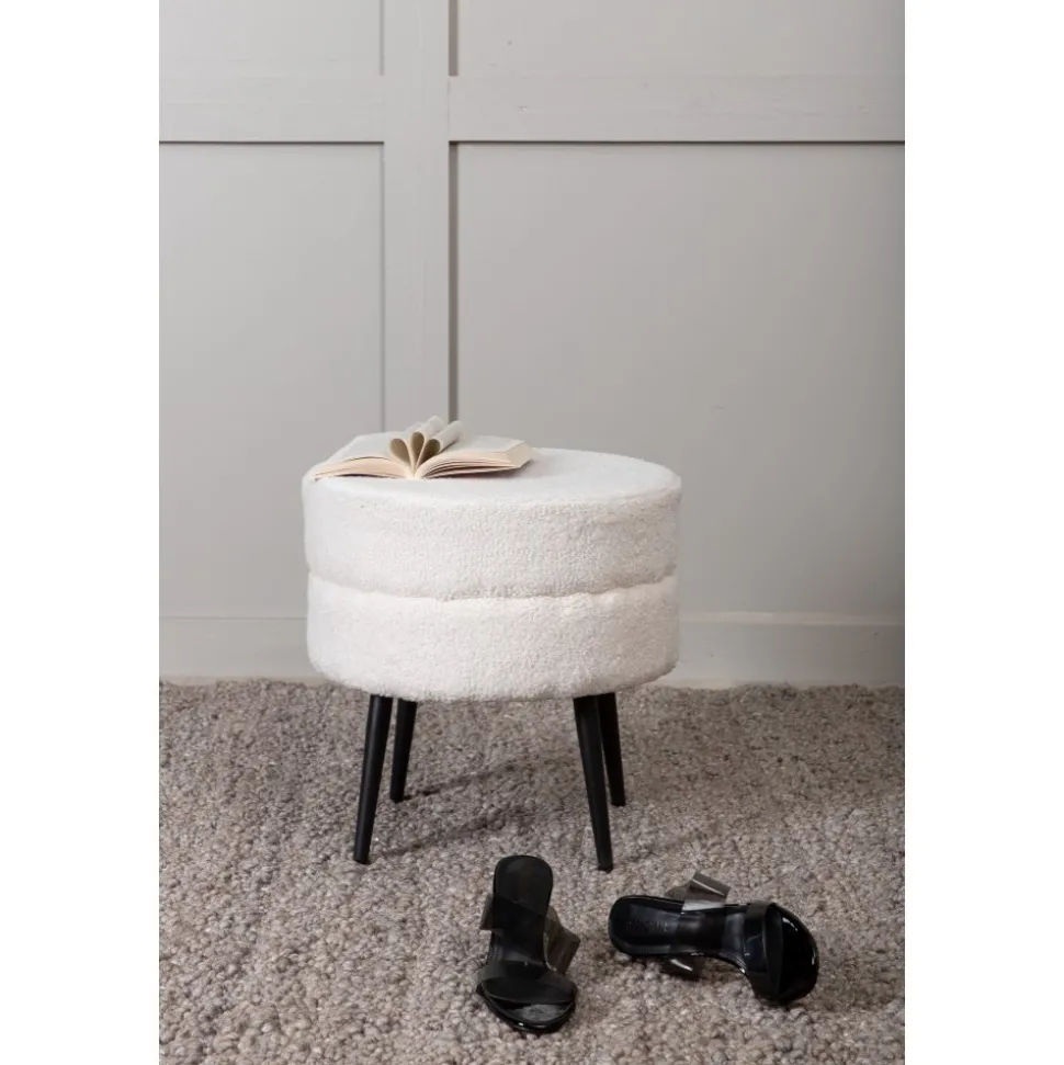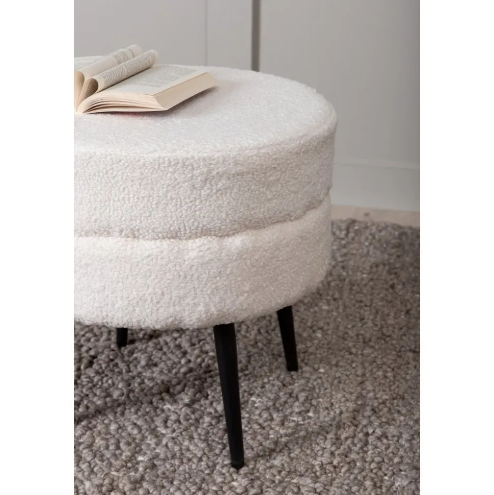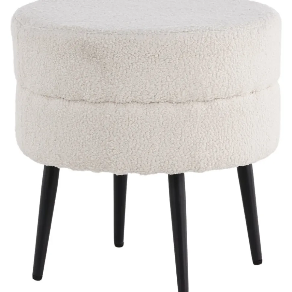 Sittpuff av trä och stål, klädd med polyestertyg.