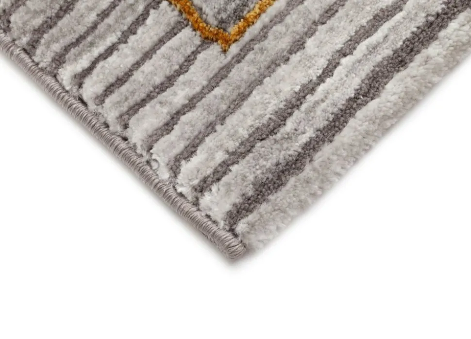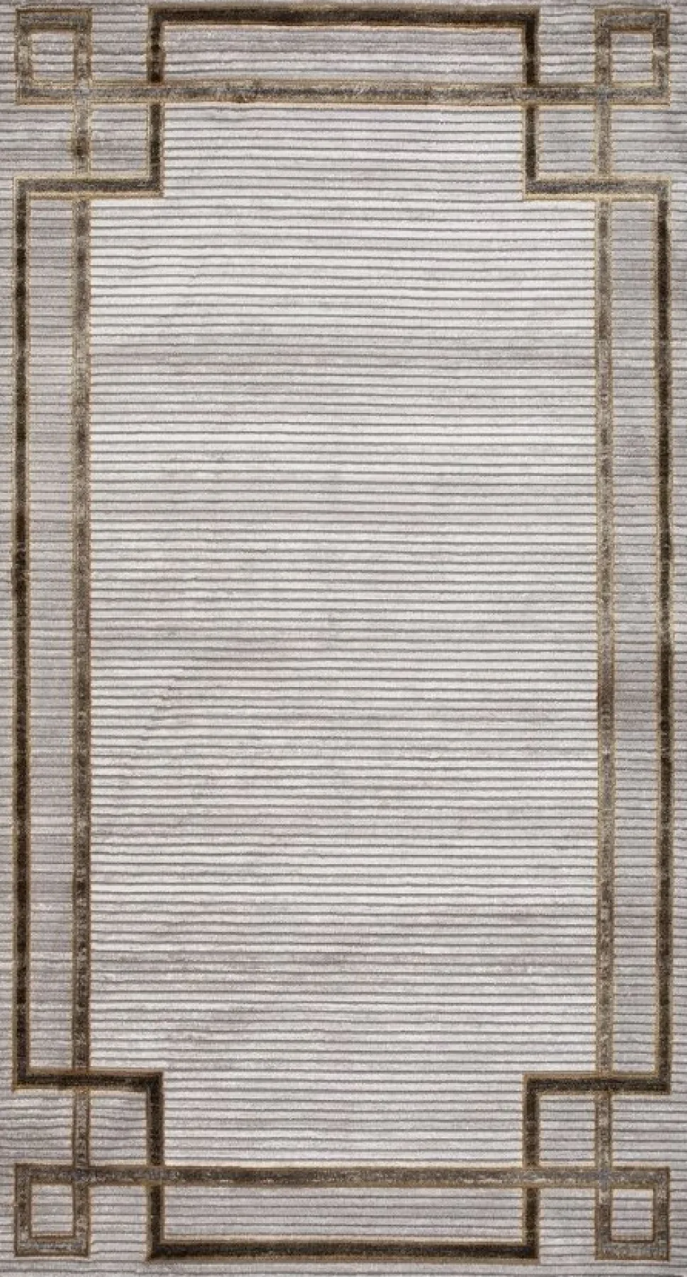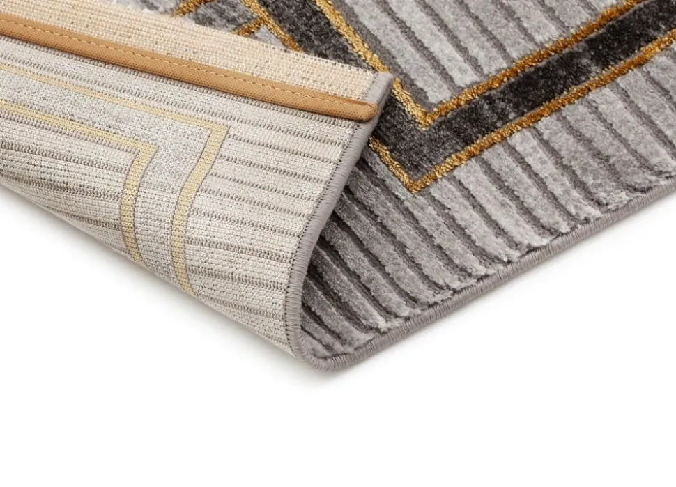 Craft Versace har en ljusgrå bottenfärg med matchande langettering som löper längs långsidorna. Mattan har ett grått randmönster som är gjort i carvingteknik, vilket innebär att den har utskärningar för att göra detaljer mer framträdande. Mattan pryds av en dekorativ bård i en otroligt snygg guldton, som skimrar beroende på hur ljuset faller.