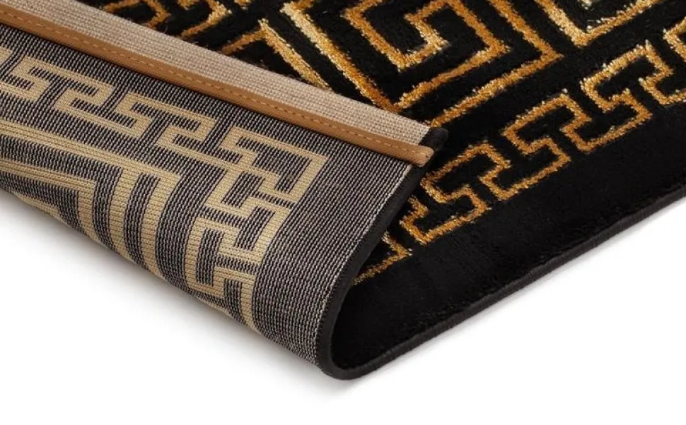 Deluxe Versace är en stilren med inspiration ifrån antikens grekiska mönster. Mattan har en svart bottenfärg med matchande langettering på långsidorna och en meanderbård i guldton, som skimrar vackert beroende på hur ljuset faller.