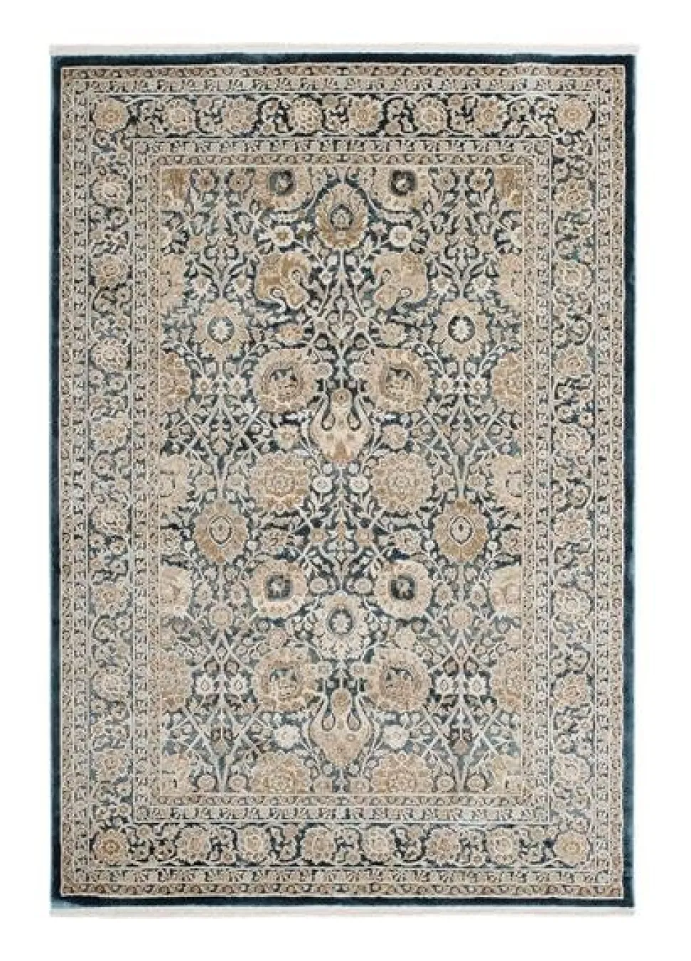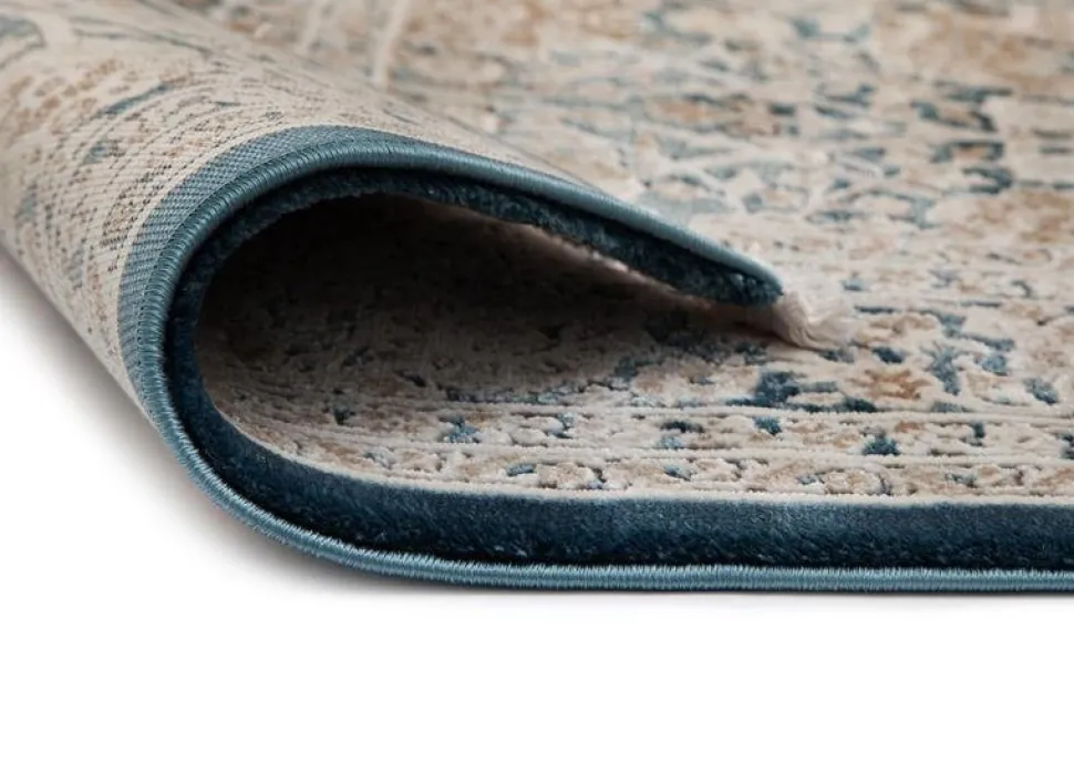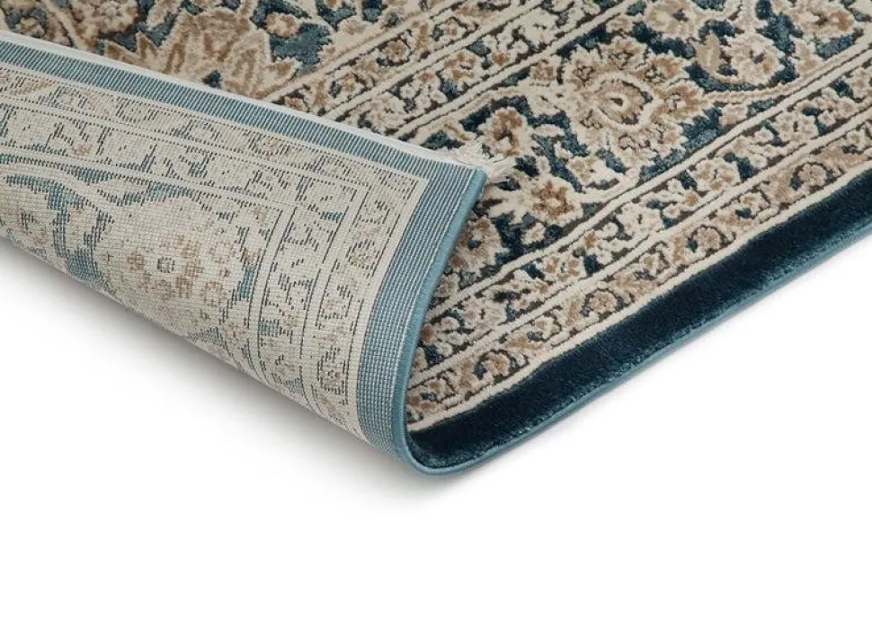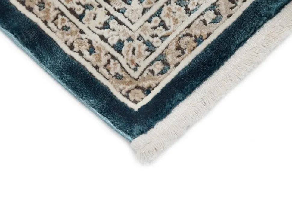Lelio är en stilren matta som har ett medaljongmönster i cremevita, svarta och beige toner. Mattan har en turkos bottenfärg med matchande langettering, medan kortsidorna pryds utav cremevita fransar. Lelio har en kort skuren lugg och är maskinvävd i polyester. Detta gör mattan tacksam att hålla ren, eftersom smuts och fläckar inte tränger in så lätt i de korta fibrerna.