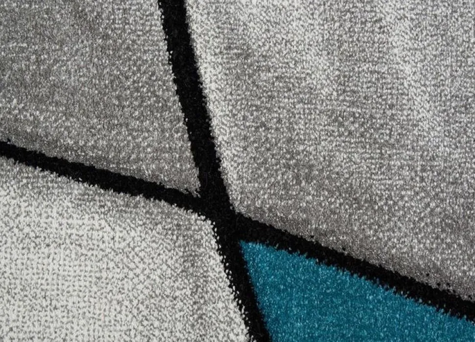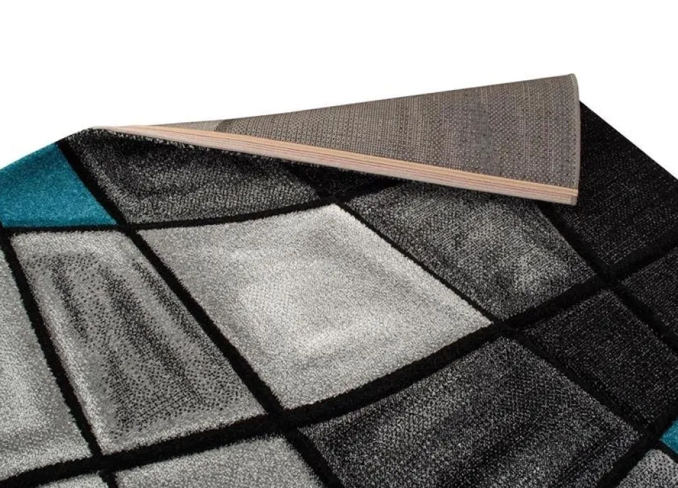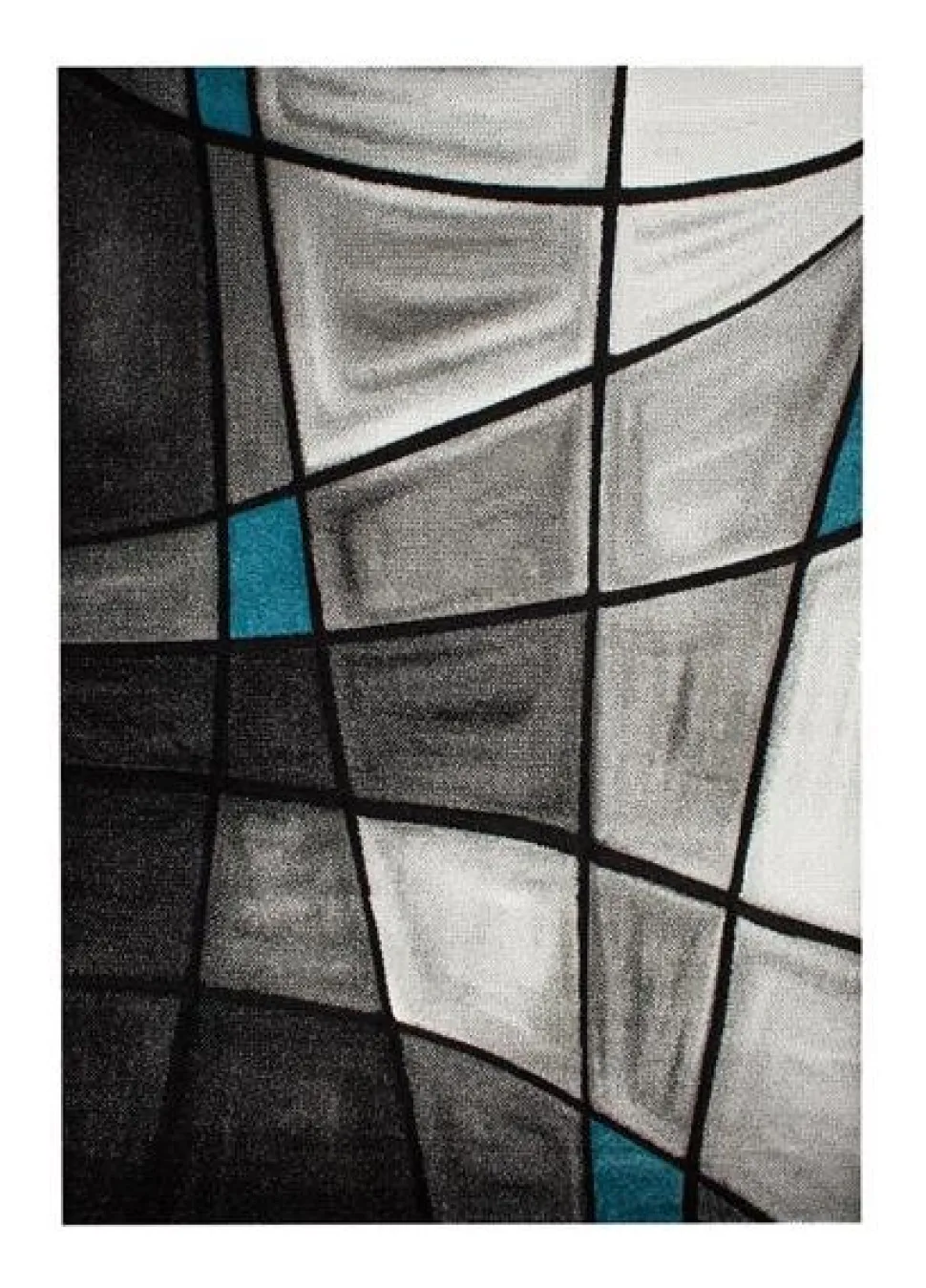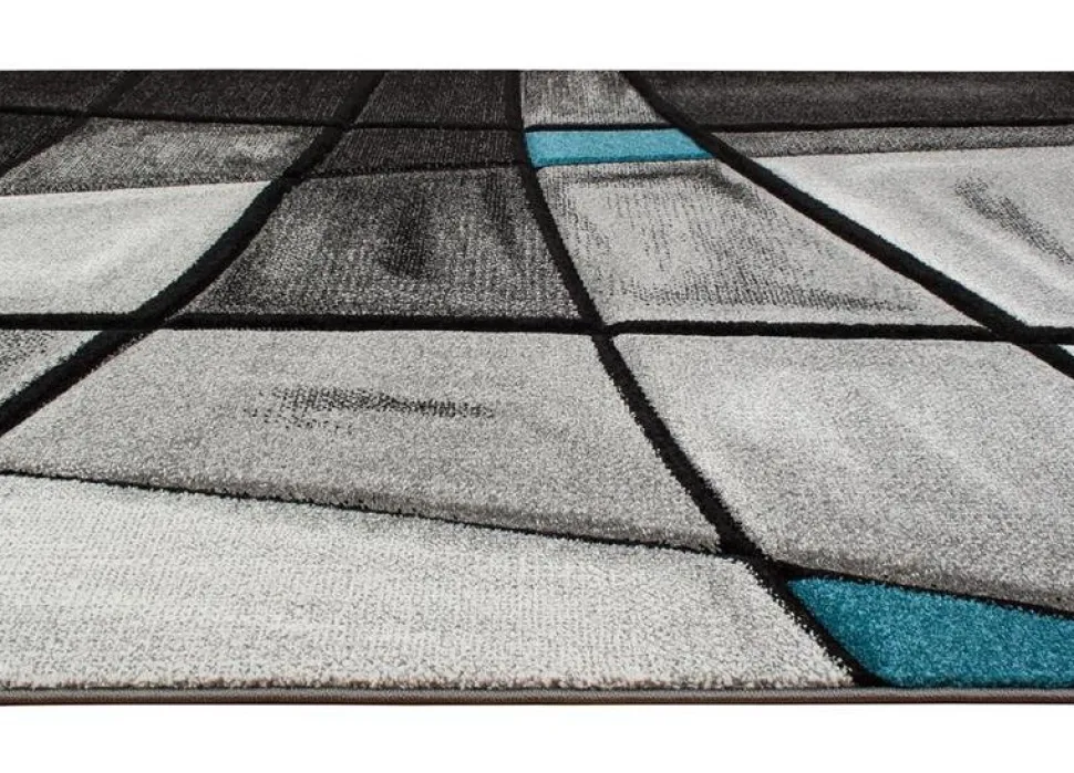 Turin är en frizematta som går i färgerna grå, vit och svart samt turkosa färgklickar som skapar en snygg kontrast utan att ta överhand. Mattan har mönster utav rutor som växlar i storlek och skapar på så sätt ett oregelbundet rutmönster. Mattan har en kort skuren lugg och är maskinvävd i polypropylen, vilket är ett syntetmaterial som är lätt att rengöra och hålla fri ifrån ludd och damm. Eftersom den har korta fibrer så tränger inte smuts in lika lätt som på en med längre fibrer och den är även resistent mot de flesta fläckar. Turin är gjord i carvingteknik, vilket innebär att den är gjord med utskärningar för att på så sätt få färger och detaljer mer framträdande och ge en större effekt.