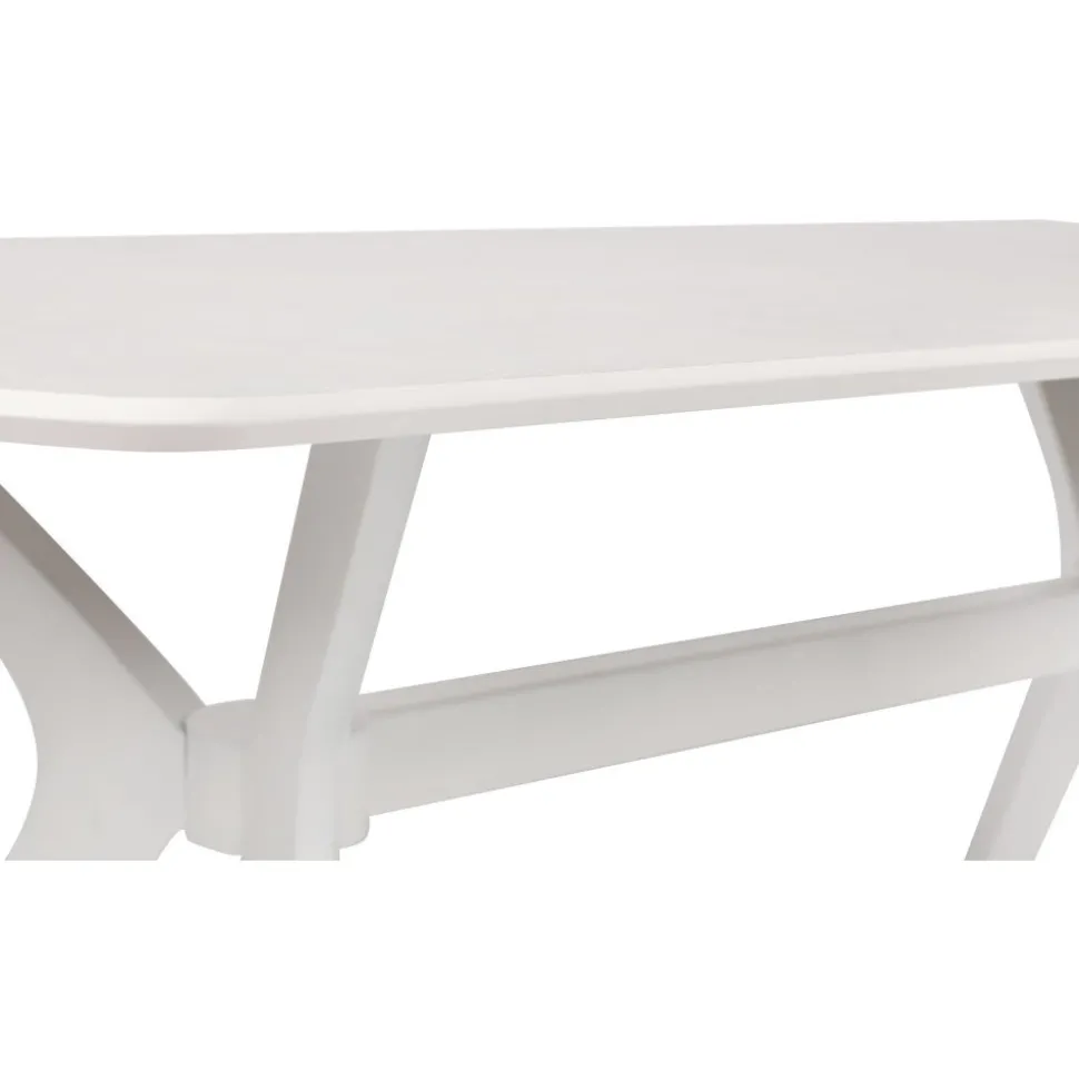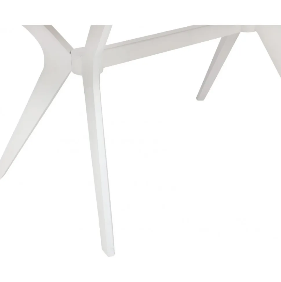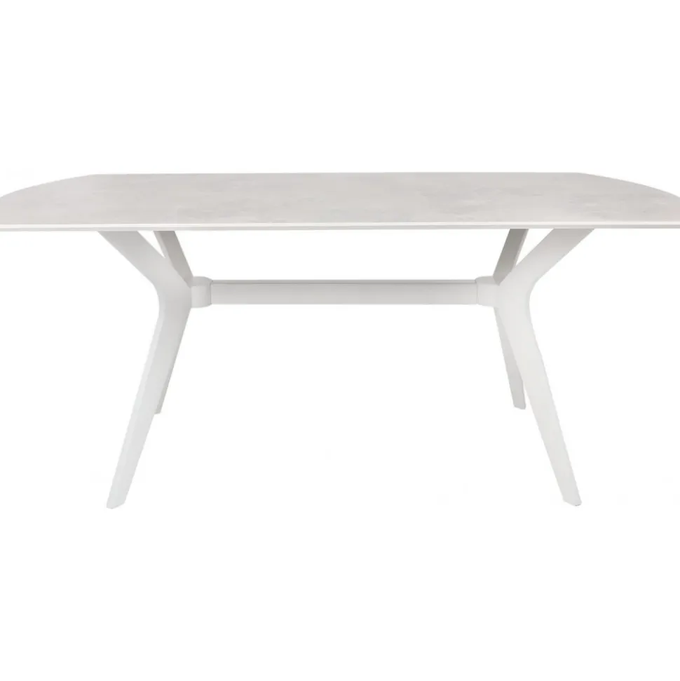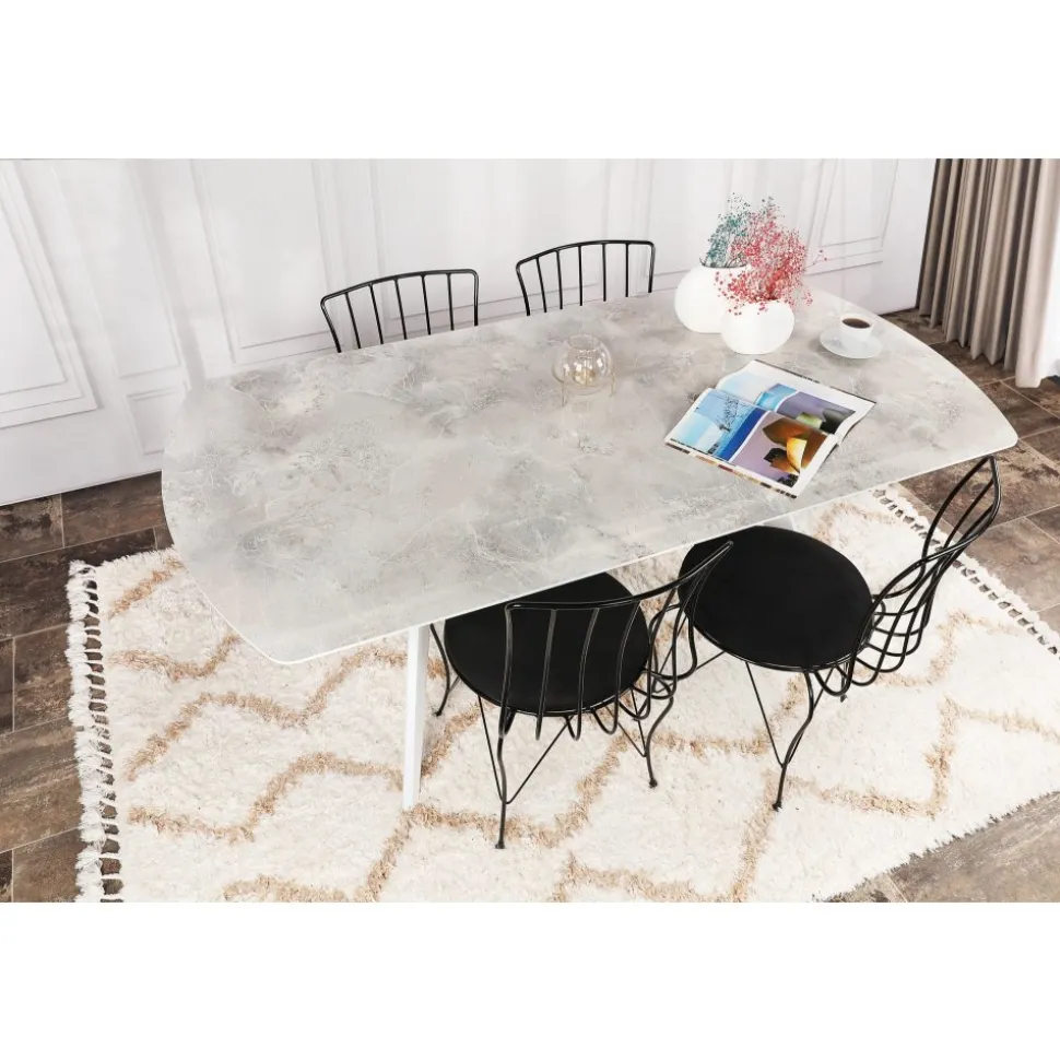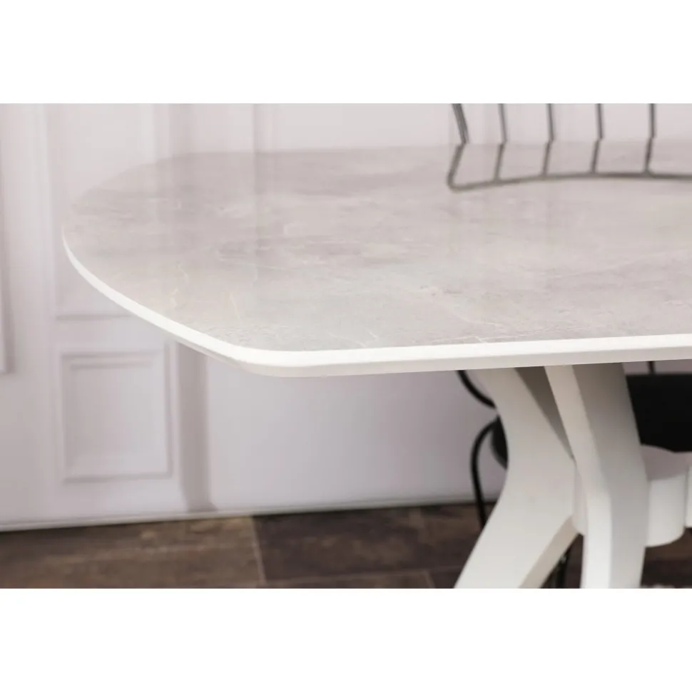 Matbord med toppskiva i fanerad beige sten på MDF skiva, vita ben.
