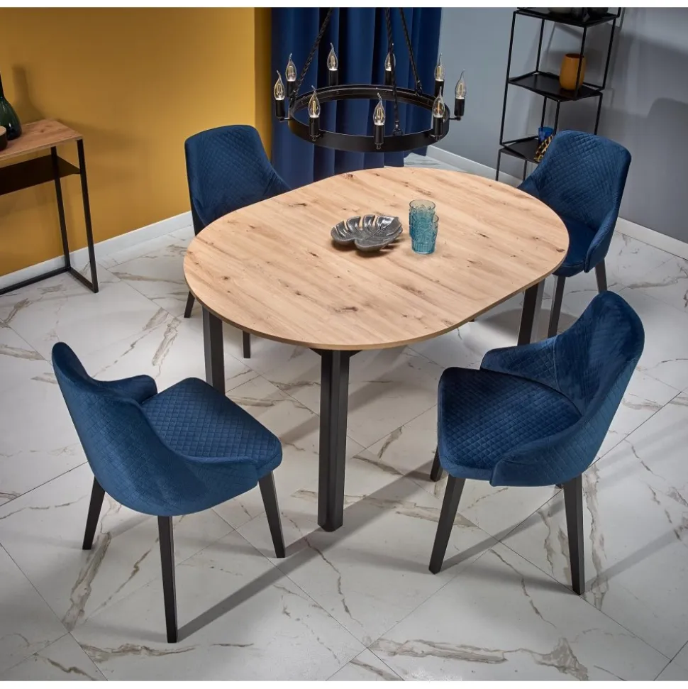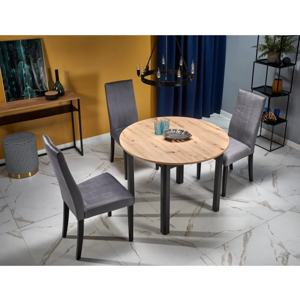 Förlängningsbart matbord Ø102 cm i diameter med en medföljande iläggsskiva förlänger bordets längd till 142 cm.