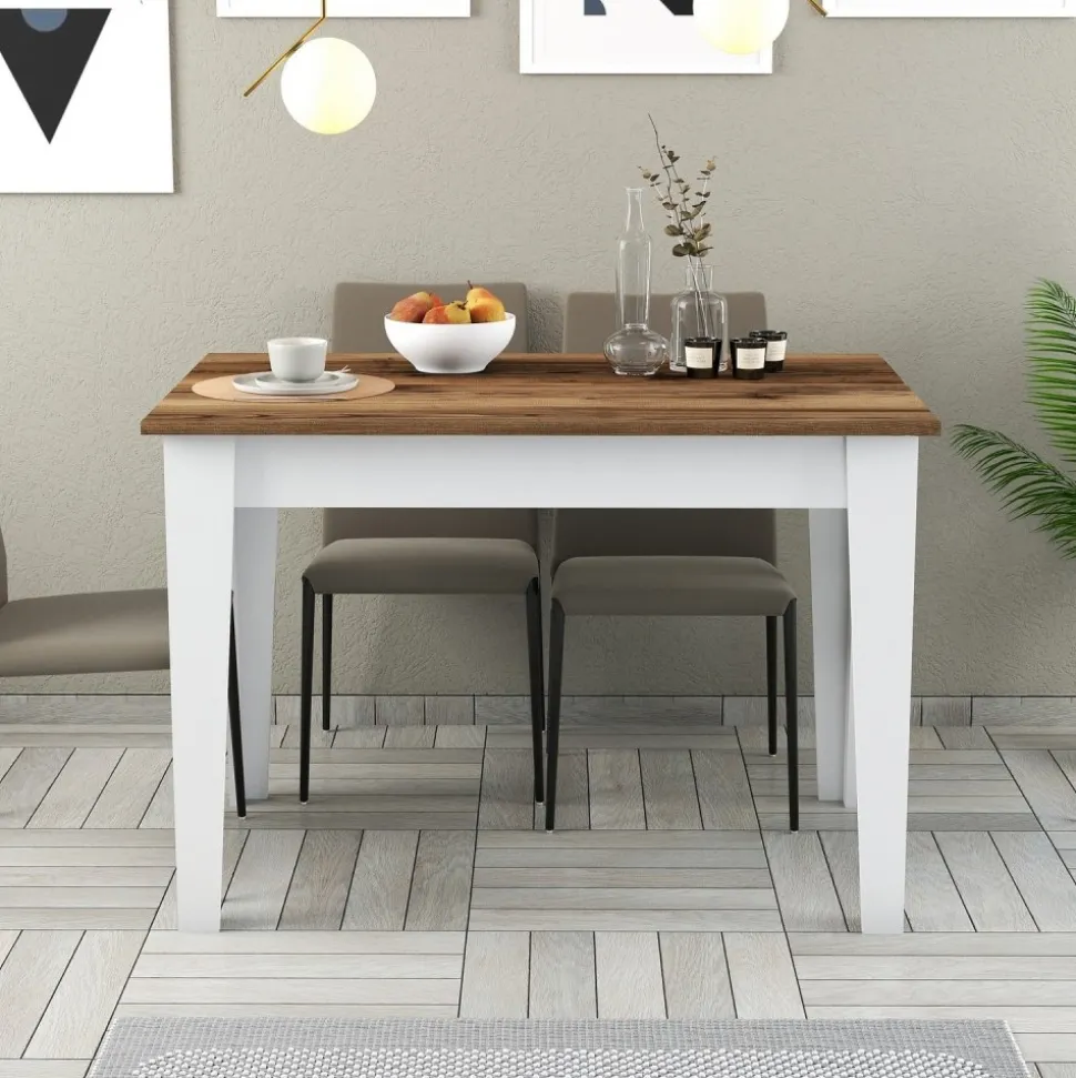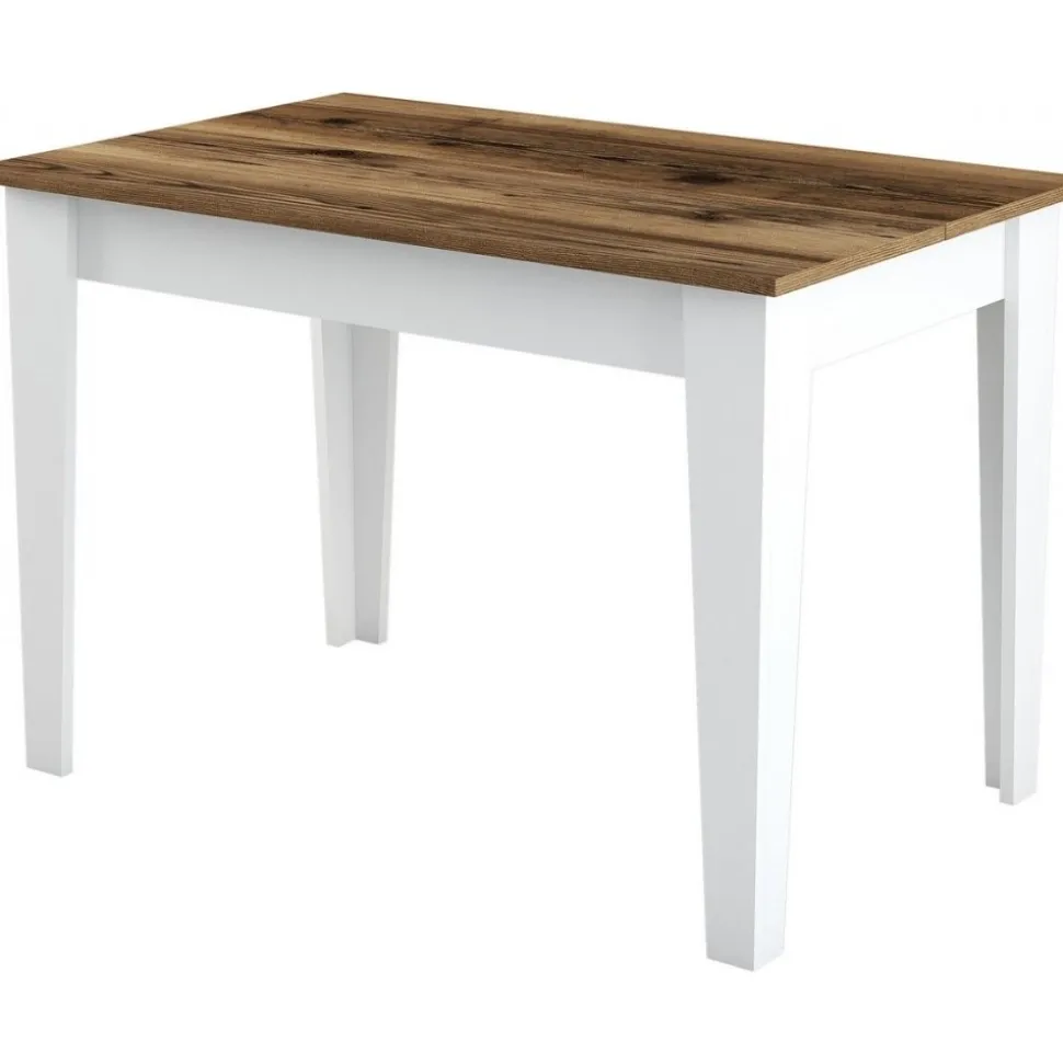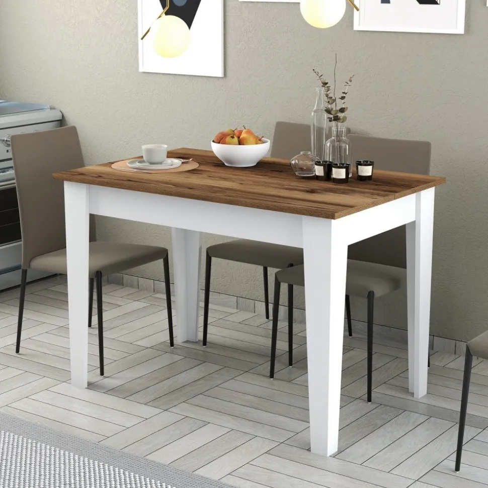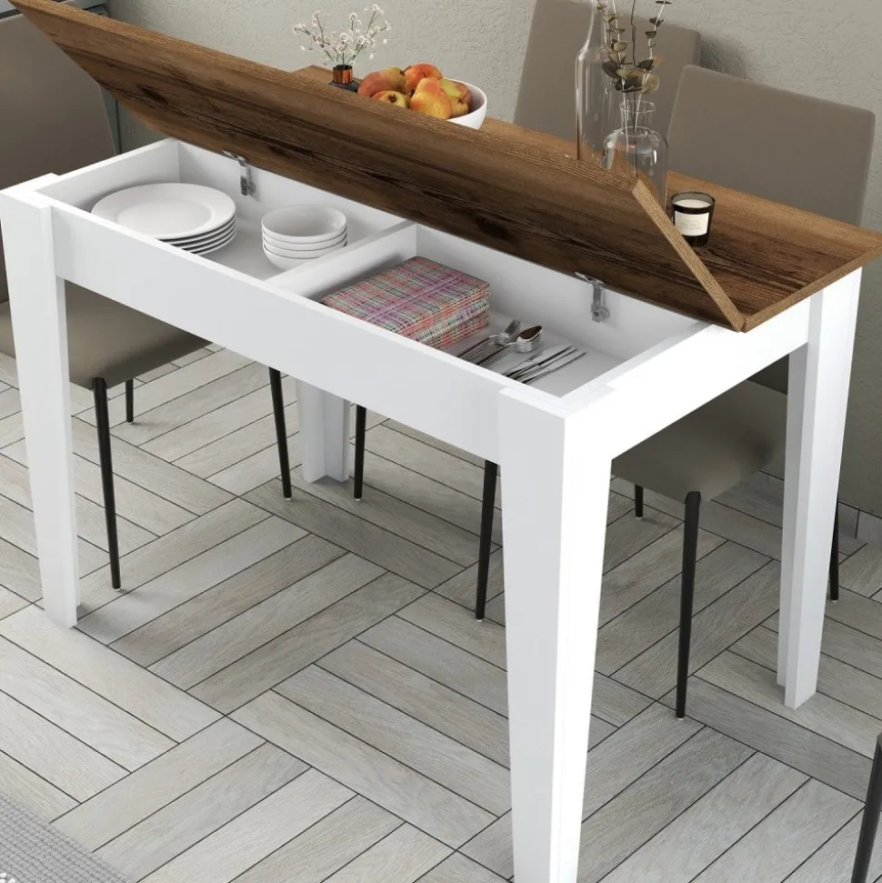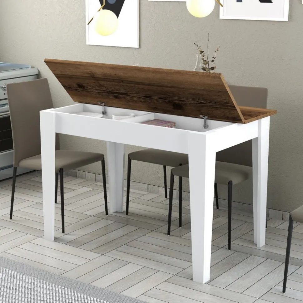 Ett stilrent och praktiskt som kombinerar modern design med funktionalitet. Under den eleganta bordsskivan döljer sig en praktisk förvaringslösning perfekt för att hålla dukar, bestick eller annat nära till hands men utom synhåll. Den varma valnötsfinishen i kombination med vit bas ger ett fräscht och tidlöst uttryck som passar i de flesta hem, oavsett om det är i köket, matsalen eller den mindre lägenheten.
