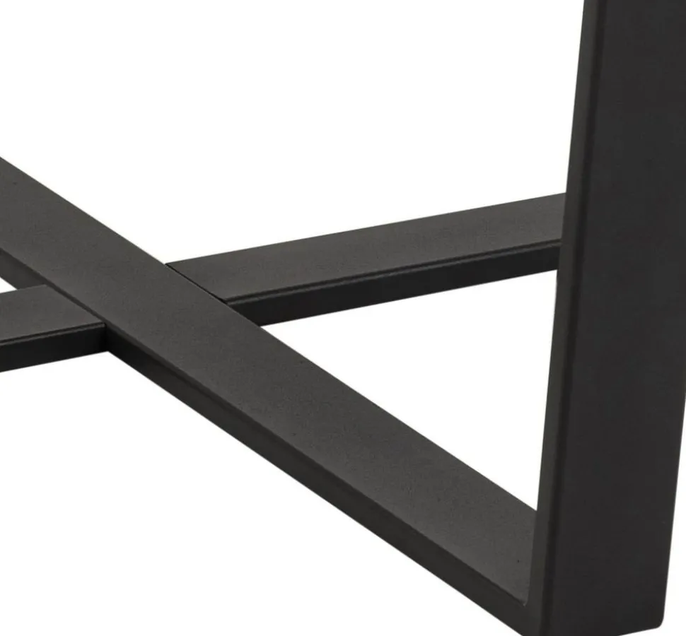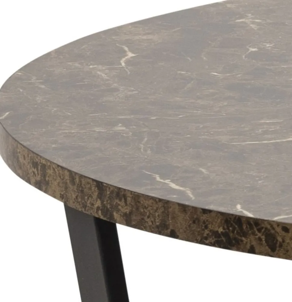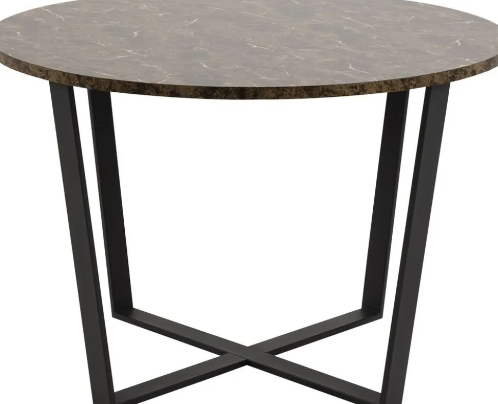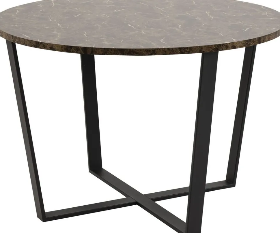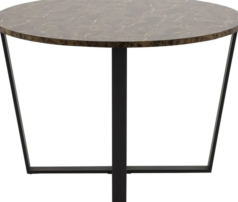 Matbord med underrede tillverkat med svart pulverlackerad metall. Bordsskiva av melamin med utförande av brun mönstrad marmor.