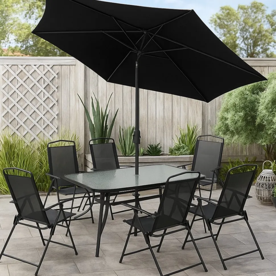 Växjö utegrupp är en komplett matgrupp som består av sex fällbara positionsstolar med svart metallstomme och bekvämt textilene-tyg. Till gruppen hör även ett matchande parasoll samt ett rektangulärt bord med en elegant, vågformad glasskiva. Den nätta designen gör utegruppen enkel att placera på både altan och uteplats. Parasollen öppnas och stängs smidigt med ett vevhandtag och kan dessutom vinklas för att ge optimal skugga.