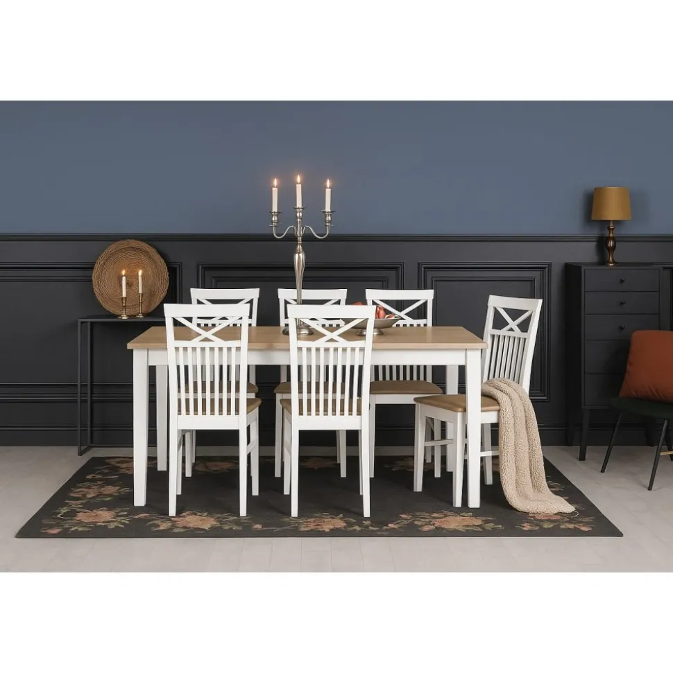 Dalön är en komplett som kombinerar klassisk formgivning med noggrant utvalda material. Med ett bord i generös storlek och sex matchande stolar skapas en enhetlig helhet som passar lika bra i köket som i matsalen.