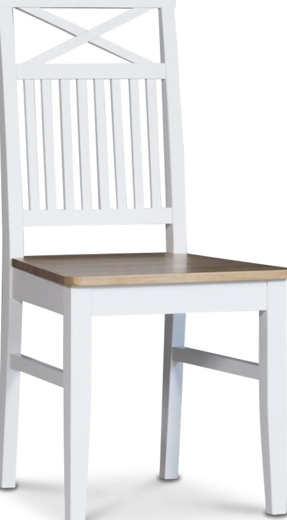 Stolarna är designade för att harmoniera med bordet med vitmålad stomme och sits samt rygg i oljad ek. Ryggens kryssdesign fungerar både som ett stabilt ryggstöd och ett dekorativt inslag som förstärker gruppens klassiska uttryck. Konstruktionen är stabil och bekväm, vilket gör stolarna väl lämpade för daglig användning.