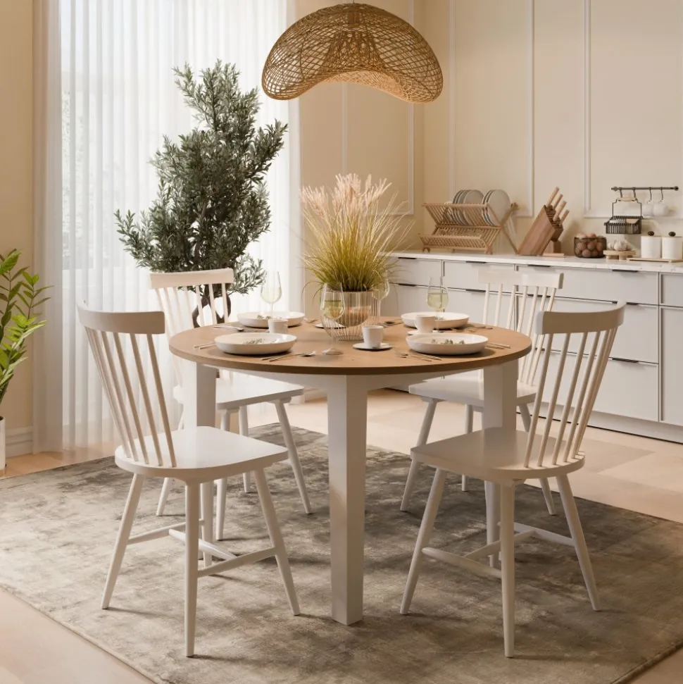 Denna Innehåller Dalarös runda matbord med vitlackat underrede och toppskiva i massiv oljad ek. Samt 4 st klassiska Karl pinnstolar.