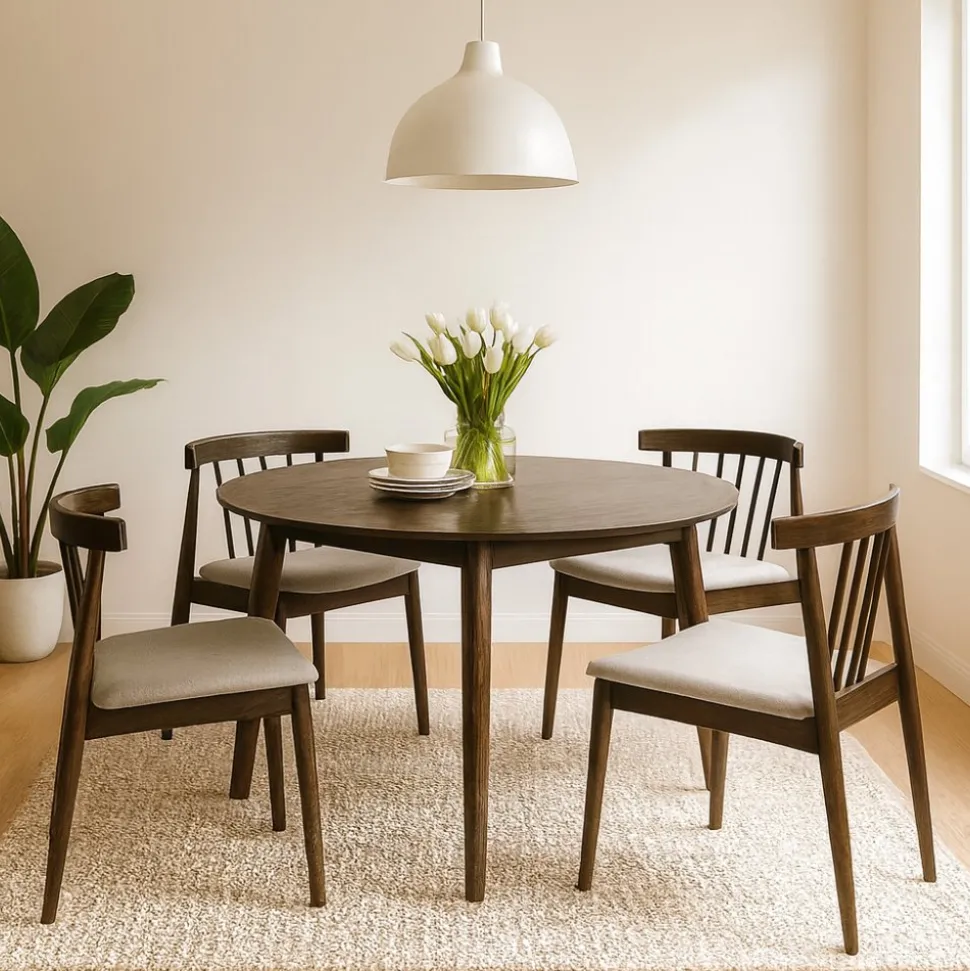 Det runda matbordet på Ø120 cm bjuder in till trivsamma måltider och samtal, med gott om plats för fyra personer. Bordsskivan i MDF med valnötsfanér vilar på rundade ben i massivt gummiträ, vilket ger både stabilitet och en varm, naturlig känsla.